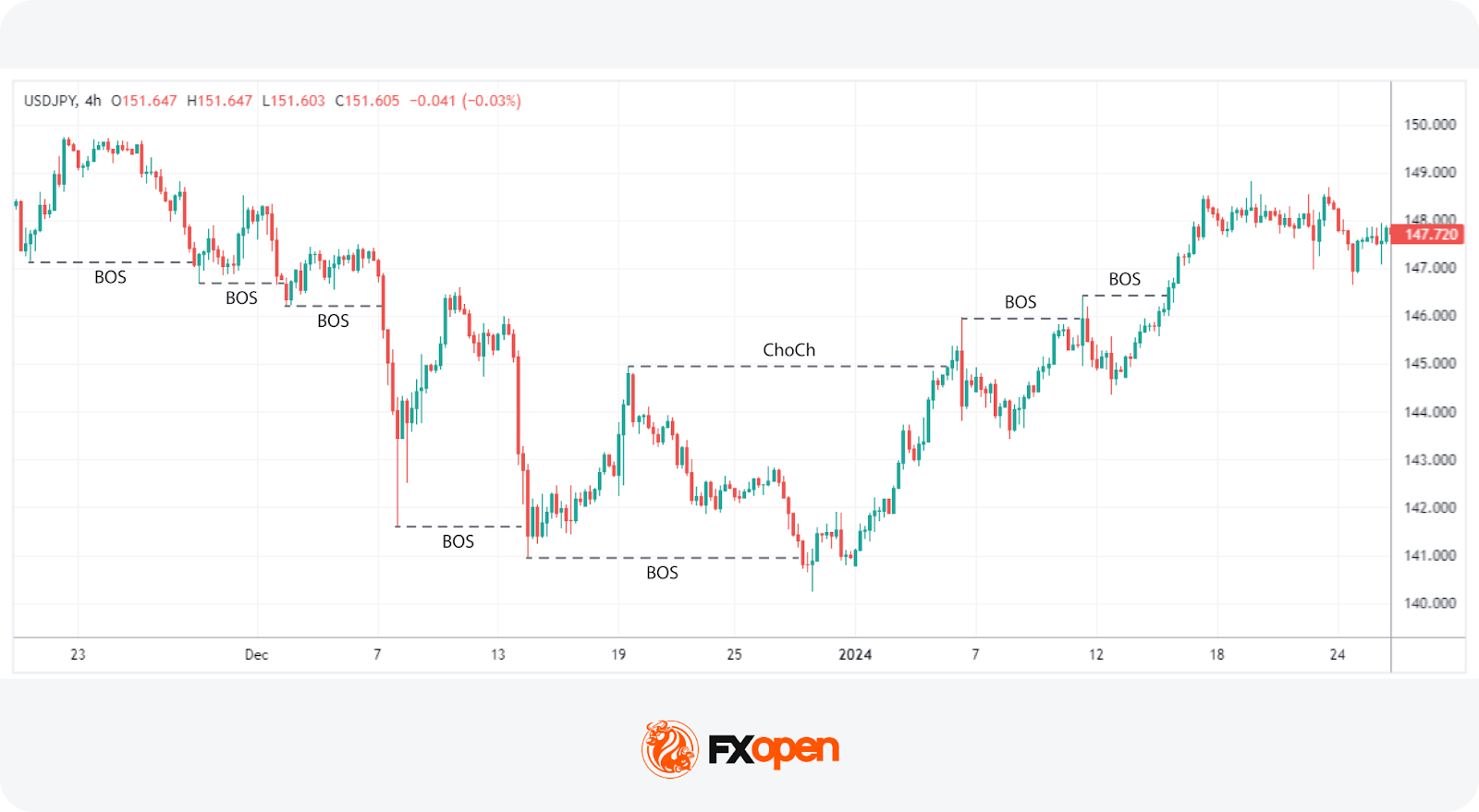 Identifying a CHoCH may help traders recognise when the market momentum is shifting, which is critical for adjusting positions to capitalise on or protect against a new trend.