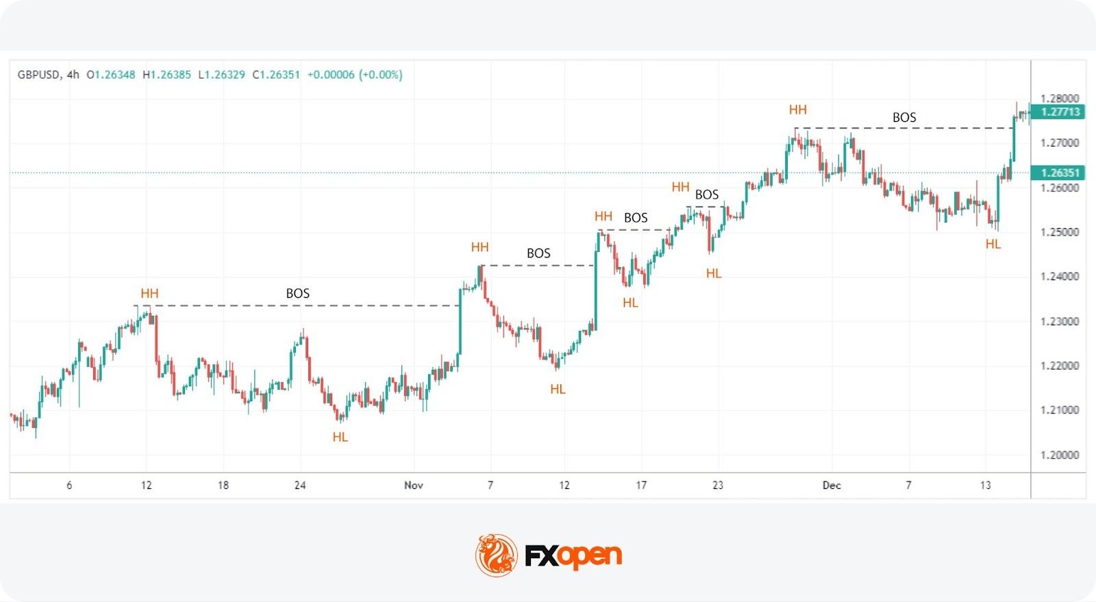 A Break of Structure (BOS) is a concept used to determine a trend continuation. It forms when the price breaks a key swing level in the direction of the existing trend, signalling that market structure remains intact. In an uptrend, this means price pushes beyond the most recent swing high while the prior higher low remains untouched.