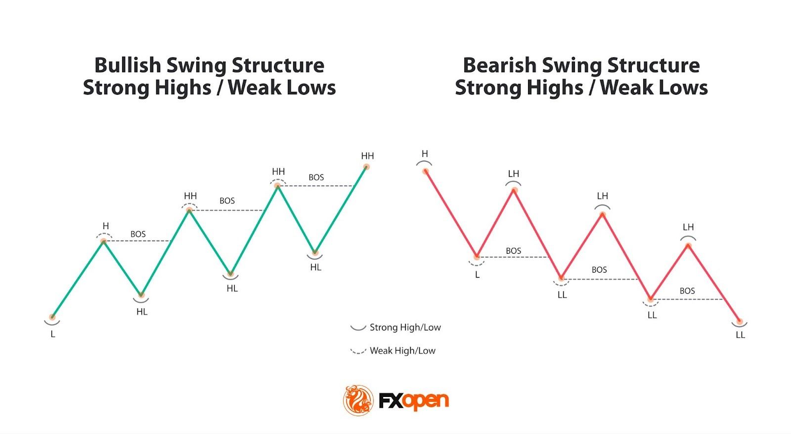 To accurately identify a BOS, traders focus on pinpointing key swing points: the strong swing point, which shouldn't be breached for the trend to remain valid, and the weak swing point, which is expected to be surpassed if the trend continues.