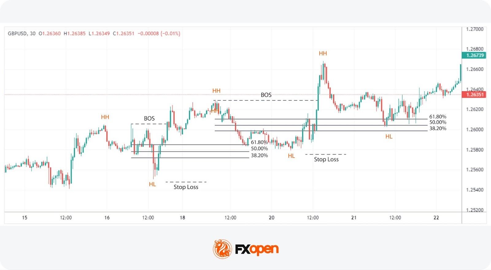 Utilising tools like the Fibonacci retracement between significant points allows traders to pinpoint potential entry zones within the context of a BOS, aligning with key levels where price retracements often stall and reverse back in favour of the prevailing trend.