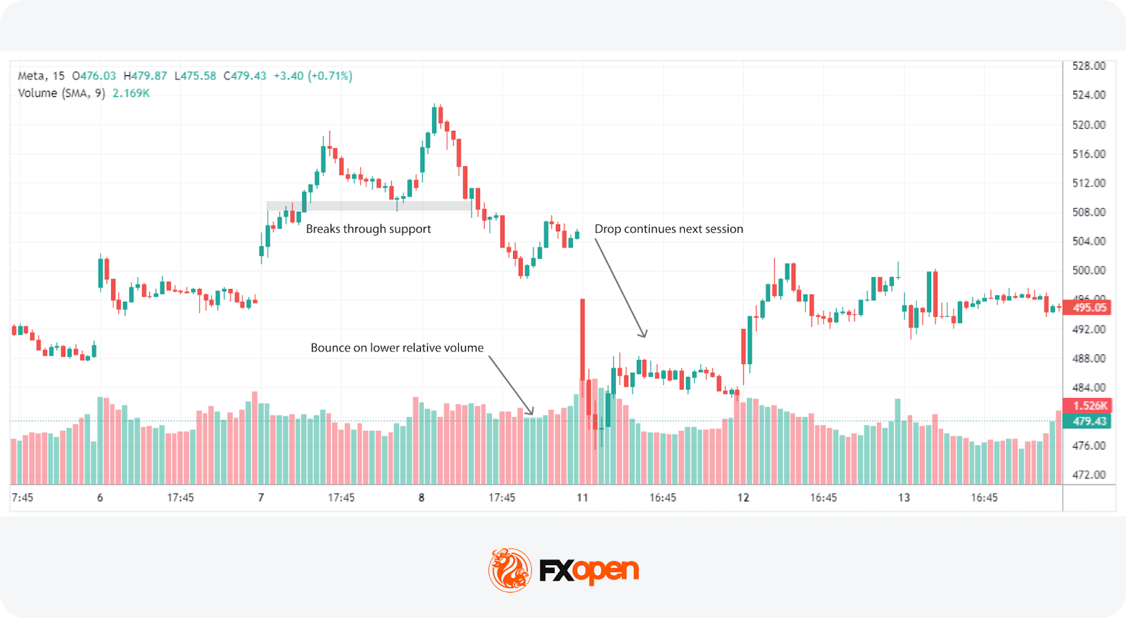 The rebound in a dead cat bounce often occurs on weaker volume, indicating less conviction behind the recovery. This is especially noticeable in assets traded on centralised exchanges, like stocks or crypto*. In forex, assessing volume can be challenging due to its decentralised nature.