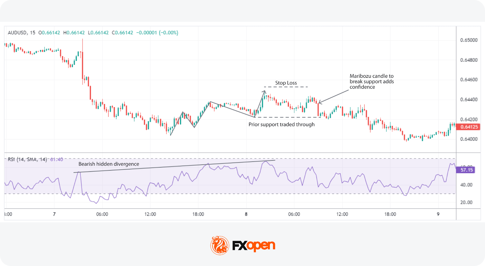 Specifically, a hidden bearish divergence, where the RSI makes a high higher than the high before or at the beginning of the downtrend; the RSI showing the asset is overbought; or the RSI struggling to break above 50 on a slightly higher timeframe (RSI < 50 indicates bearish conditions) can add confirmation.