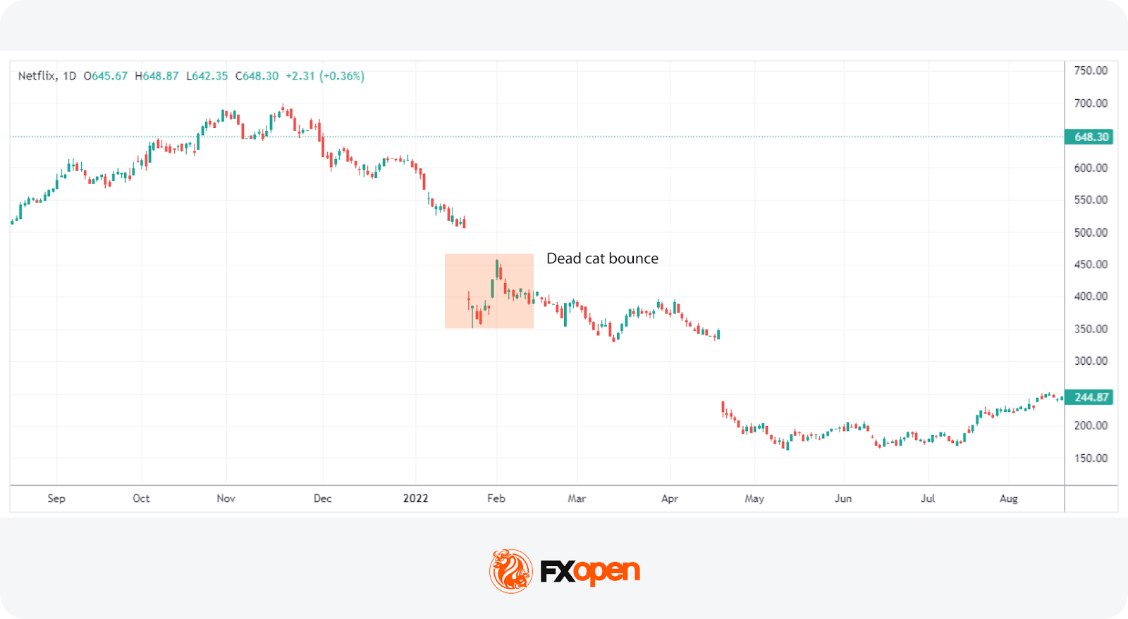 A dead cat bounce is a temporary recovery in the price of a falling asset, followed by a continuation of the downtrend. This phenomenon occurs in all types of financial markets, including stocks, forex, and crypto*, and can mislead traders into believing that a market or asset has started to recover, only to see prices fall again.