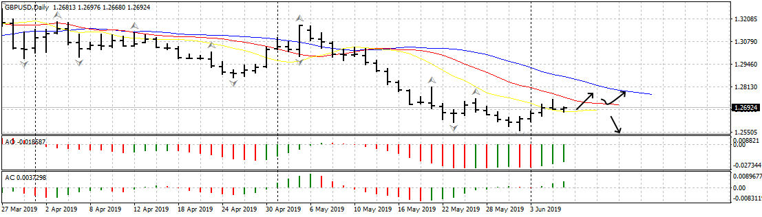 Британская валюта успешно корректируется, несмотря на хроническую усталость инвесторов и участников рынка от Brexit. 31 мая был сформирован разворотный бар на покупку с точкой входа 1.2540, который был успешно взят в отработку. На данный момент цена пытается справиться с сопротивлением у линий аллигатора на дневном таймфрейме. Если попытка окажется удачной ждем роста к 1.2940-1.2820, в противном случае стоит ожидать еще одного подхода к 25 фигуре.