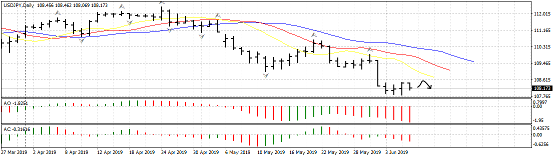 Вчерашний фундамент из США оказался сильно разнонаправленным. Так, изменение числа занятых в несельскохозяйственном секторе, от ADR за май оказалось на уровне 27К против прогноза в 180К. В то же время индекс деловой активности в непроизводственном секторе(PMI) от ISM за май оказался намного лучше прогноза: 56,9 против 55,5. Скорее всего, рост последнего показателя позволил паре прервать падение и откорректироваться к 108.50. Дальнейший тренд по usd/jpy зависит от завтрашних NonFarm, и развития ситуации по торговым пошлинам в отношении США и Китая.