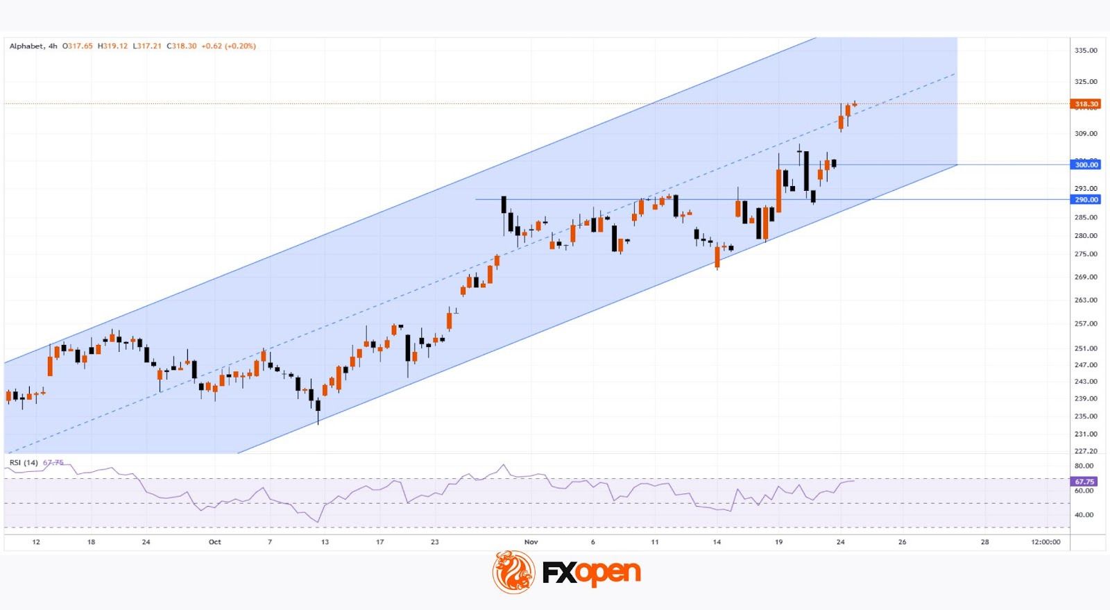 Как свидетельствуют графики, цена акции Alphabet (GOOGL) поднялась на исторический максимум, закрывшись в районе $318. Таким образом: