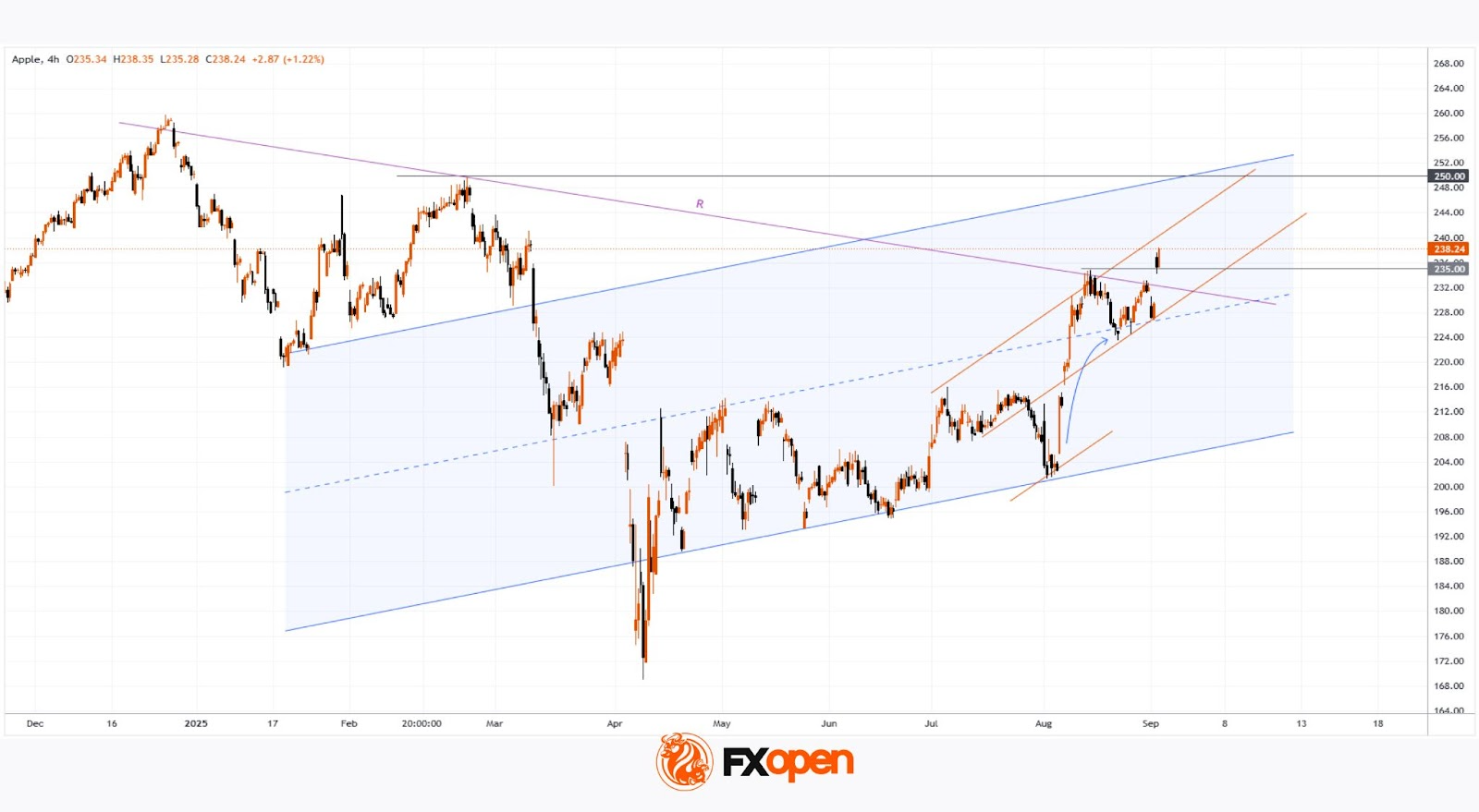 → цена AAPL поднялась выше, что дало основание для расширения синего канала;