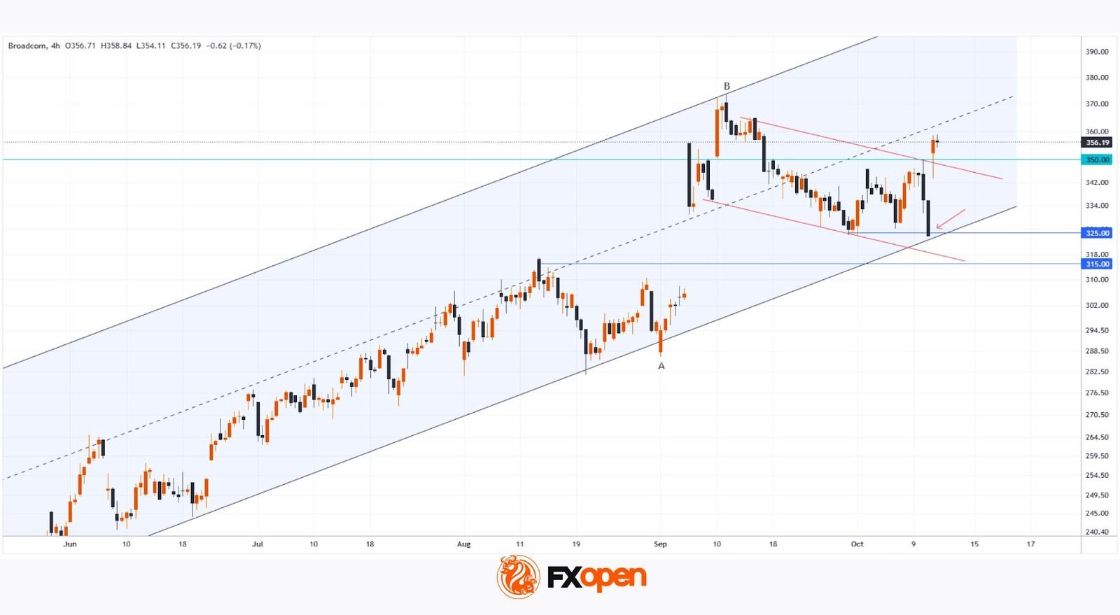 В прошлом месяце новости о партнерстве с OpenAI стали сильным бычьим драйвером для акций NVDA. В октябре – аналогичный эффект наблюдается на графике акций Broadcom (AVGO).