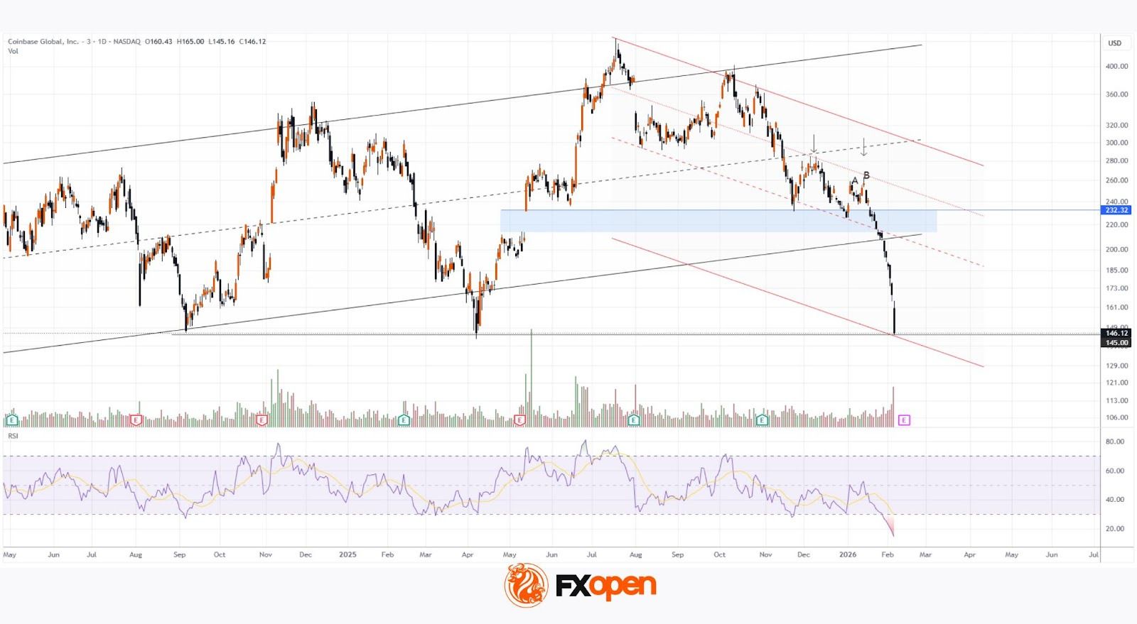 Падение биткоина более чем на 50% за 5 месяцев прямо повлияло на курс акций криптобиржи Coinbase (COIN) – они опустились ниже $150 впервые с апреля 2025 года.