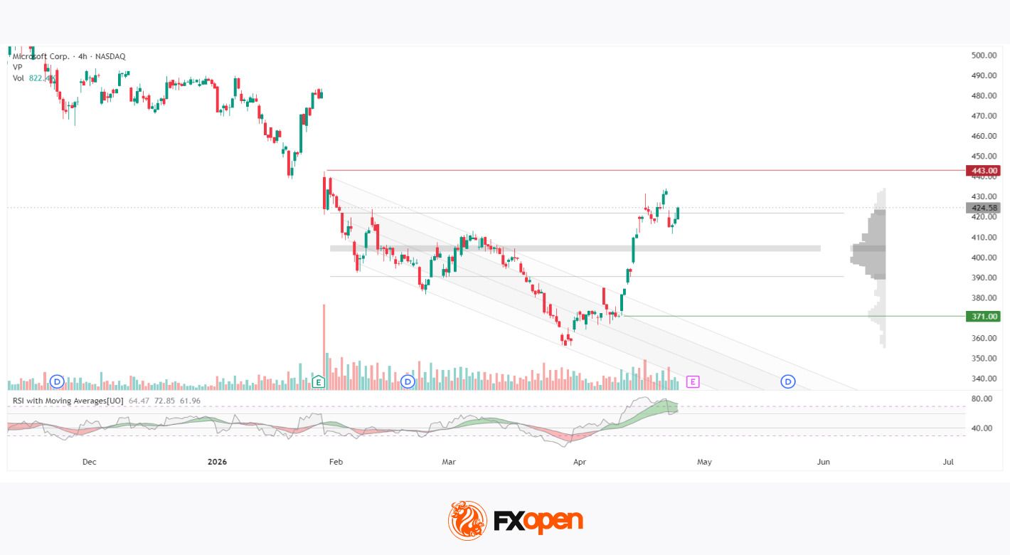 Консолидация 412–433 формируется накануне публикации результатов третьего квартала 29 апреля — события, аналогичного тому, которое в январе запустило двухмесячное снижение. Профиль горизонтального объёма показывает, что котировки торгуются выше зоны баланса 403–406, а RSI удерживается в положительной зоне. Реакция рынка на предстоящую отчётность определит, получит ли восстановительное движение продолжение или вернёт цену в диапазон накопленного объёма.