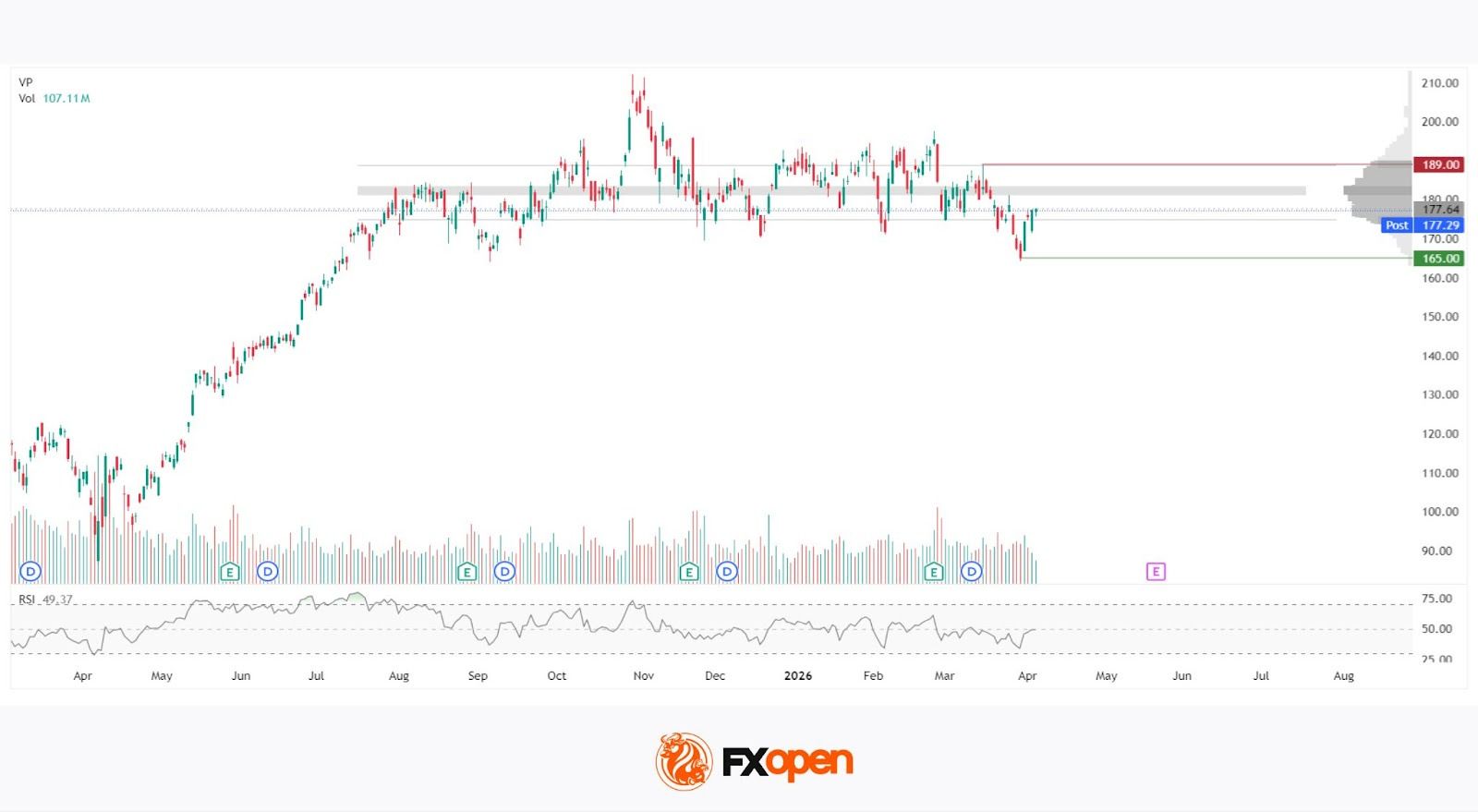 После достижения исторического максимума в районе 210 в конце октября 2025 года котировки перешли в стадию нисходящей коррекции. Нижней точкой коррекции стала отметка 165, зафиксированная 30 марта 2026 года, — от которой сформировался отскок вверх, однако котировки остаются в районе 177, не демонстрируя уверенного восстановления. Профиль горизонтального объёма уточняет картину.