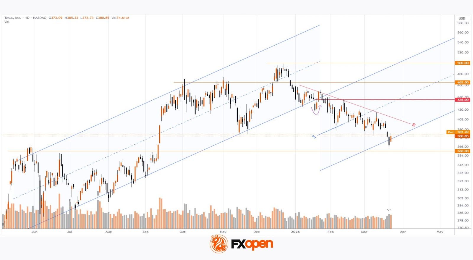 Как свидетельствует график, акции Tesla (TSLA) находились под сильным давлением с начала 2026 года: с декабрьского максимума они потеряли около 25% стоимости. Медвежьими драйверами выступали: