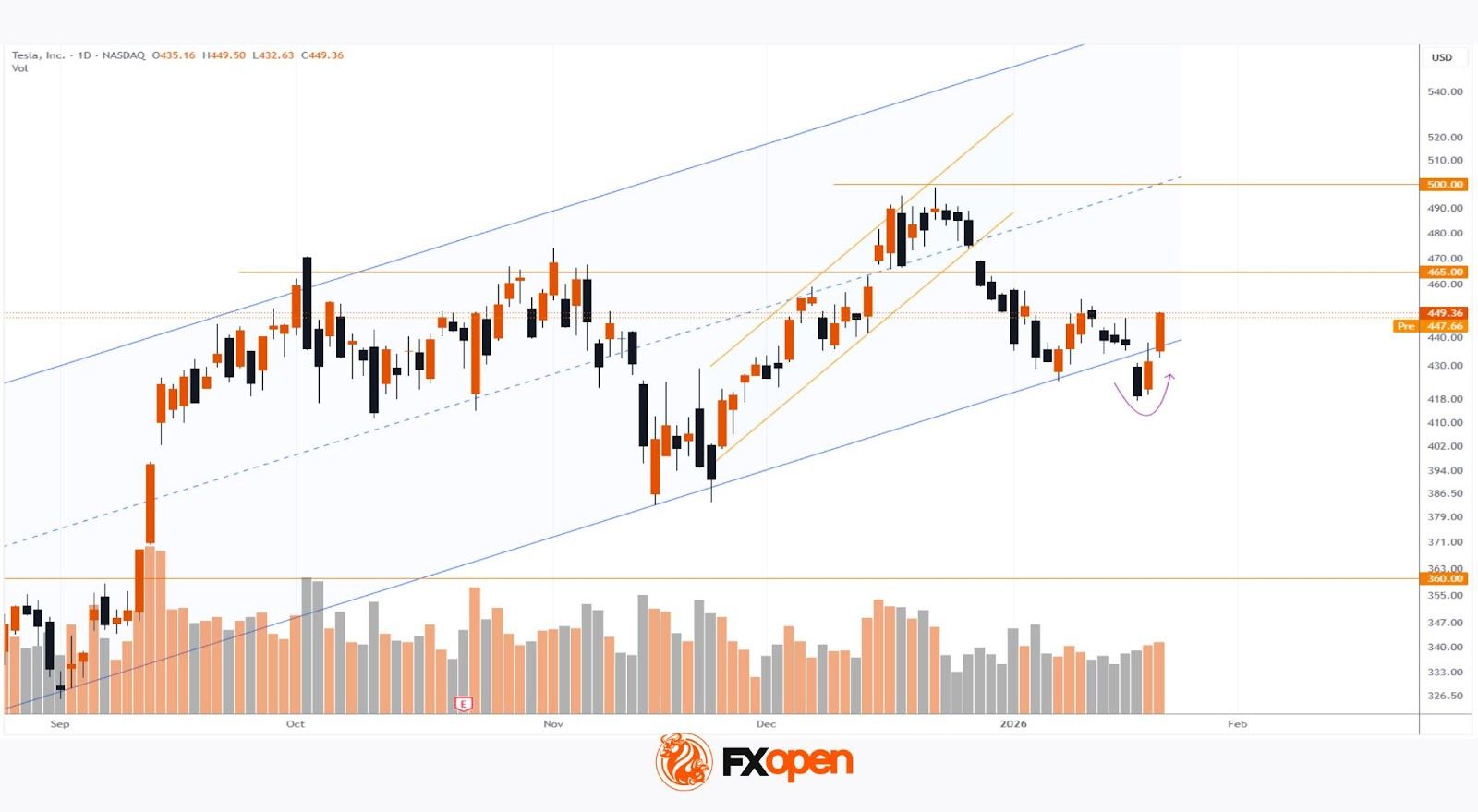 → предположили, что цена TSLA может опуститься к нижней границе восходящего канала.
