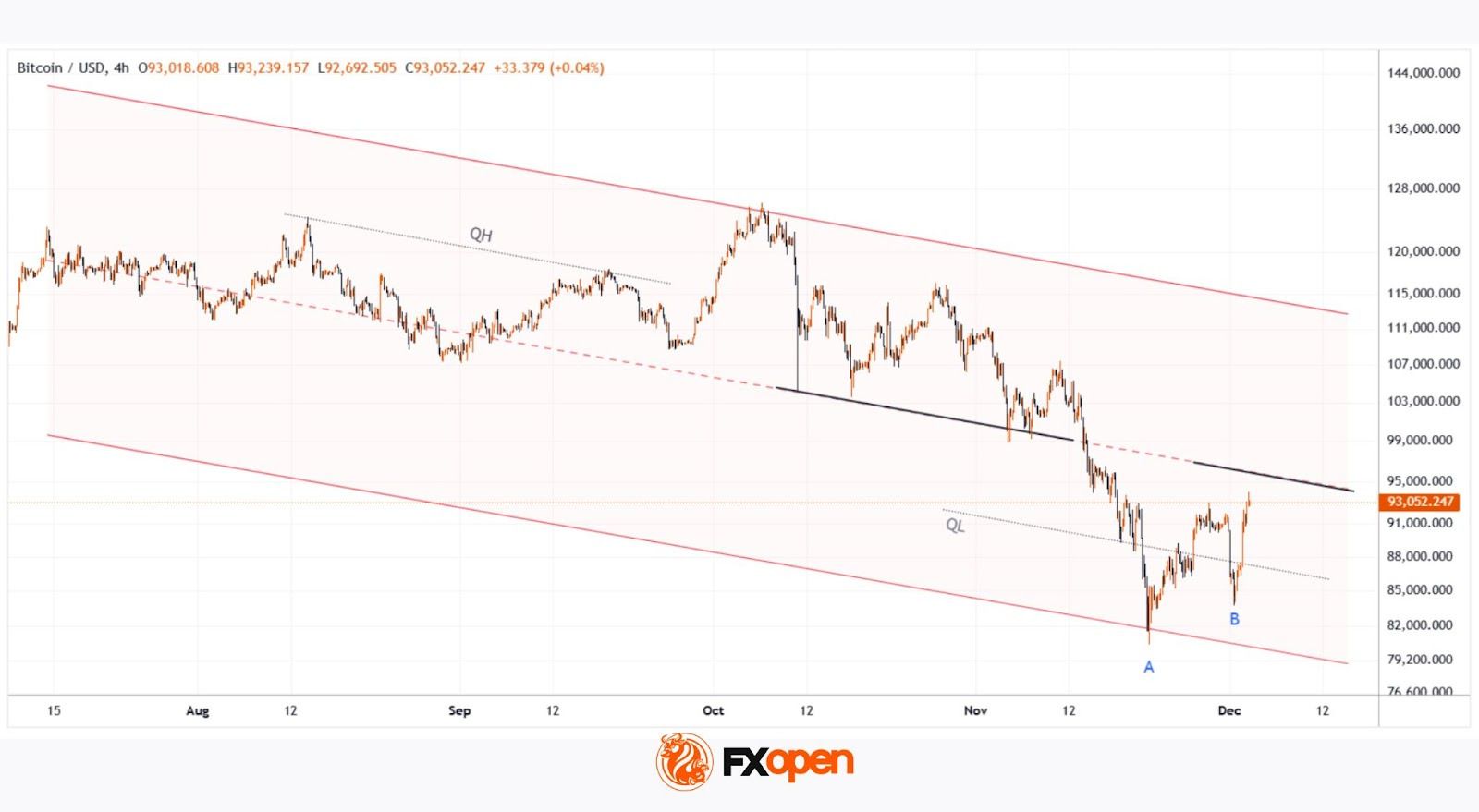 Начиная с летних месяцев цена биткоина развивает нисходящий канал (показан красным цветом), при этом: