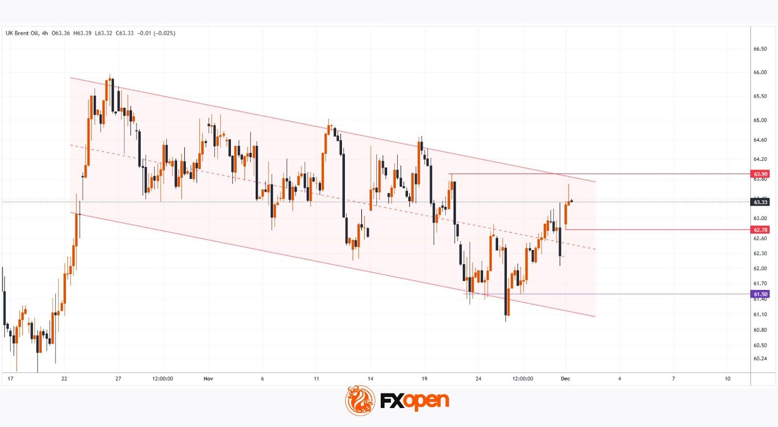 Хотя расширения вниз не произошло, нисходящий канал сохраняет актуальность. Движение цены вниз было встречено активностью спроса (заметно по длинным нижним теням на свечах в конце ноября в районе уровня $61.50), что привело к развороту вверх от нижней границы канала.