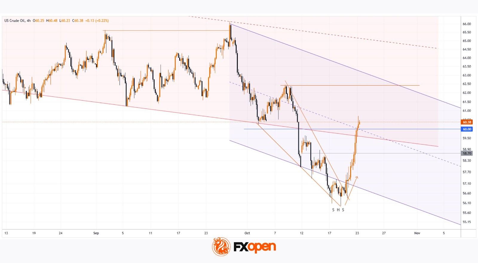 Как свидетельствует график XTI/USD, сегодня нефть WTI торгуется выше психологического уровня $60 после резкого повышения с минимума октября более чем на 3%.