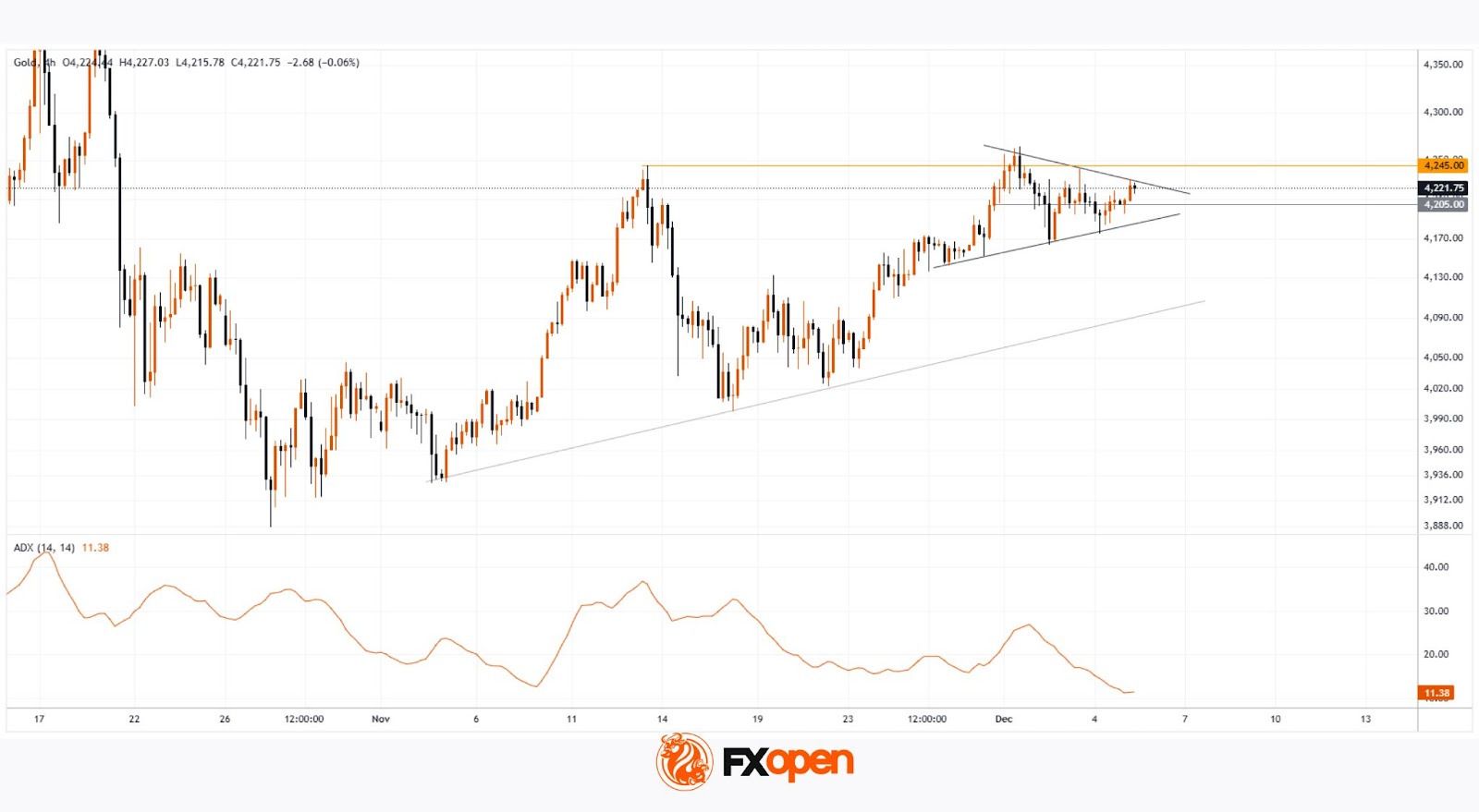 Важно заметить, что 1 декабря был замечен рост над максимумом ноября – это движение произошло на фоне достижения исторического максимума на рынке серебра (о чем мы предполагали в аналитической заметке 27 ноября). Но закрепиться над уровнем $4245 быкам не удалось – это признак дефицита покупателей. Видимо, им нужны достаточно весомые аргументы, чтобы покупать золото так дорого.