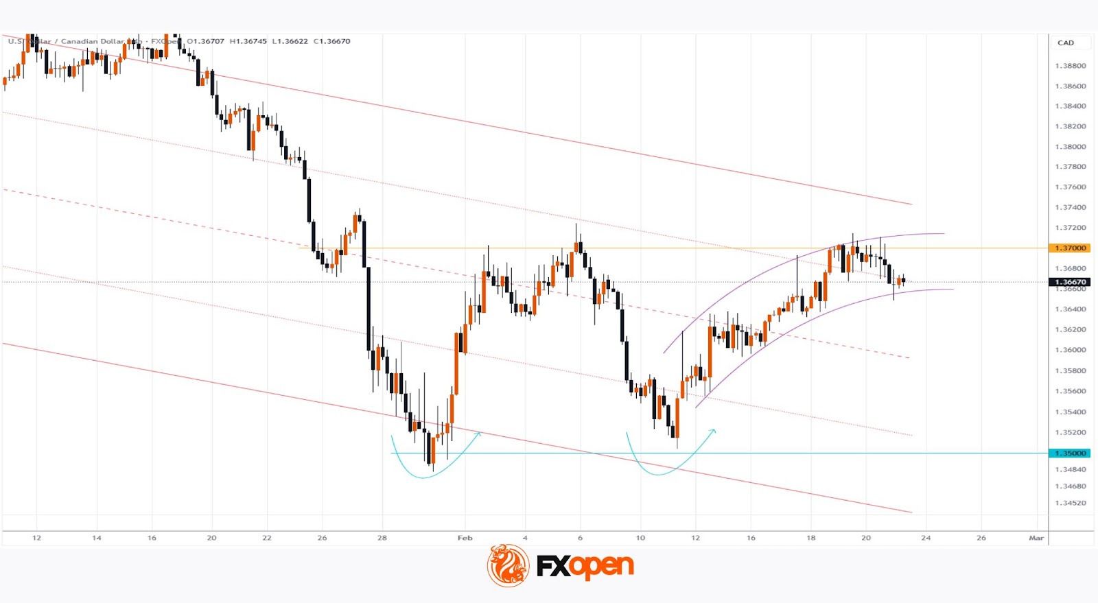 В частности, сегодня валютная пара USD/CAD опустилась ниже уровня 1,3660, хотя начиная с 11 февраля мы можем наблюдать восходящую динамику (отмечена фиолетовыми линиями) – она сформировалась на фоне данных о замедлении инфляции в Канаде с 2.7% до 2.4%, которые ослабили CAD, так как рынок начал закладывать возможность снижения процентных ставок Банком Канады в будущем.