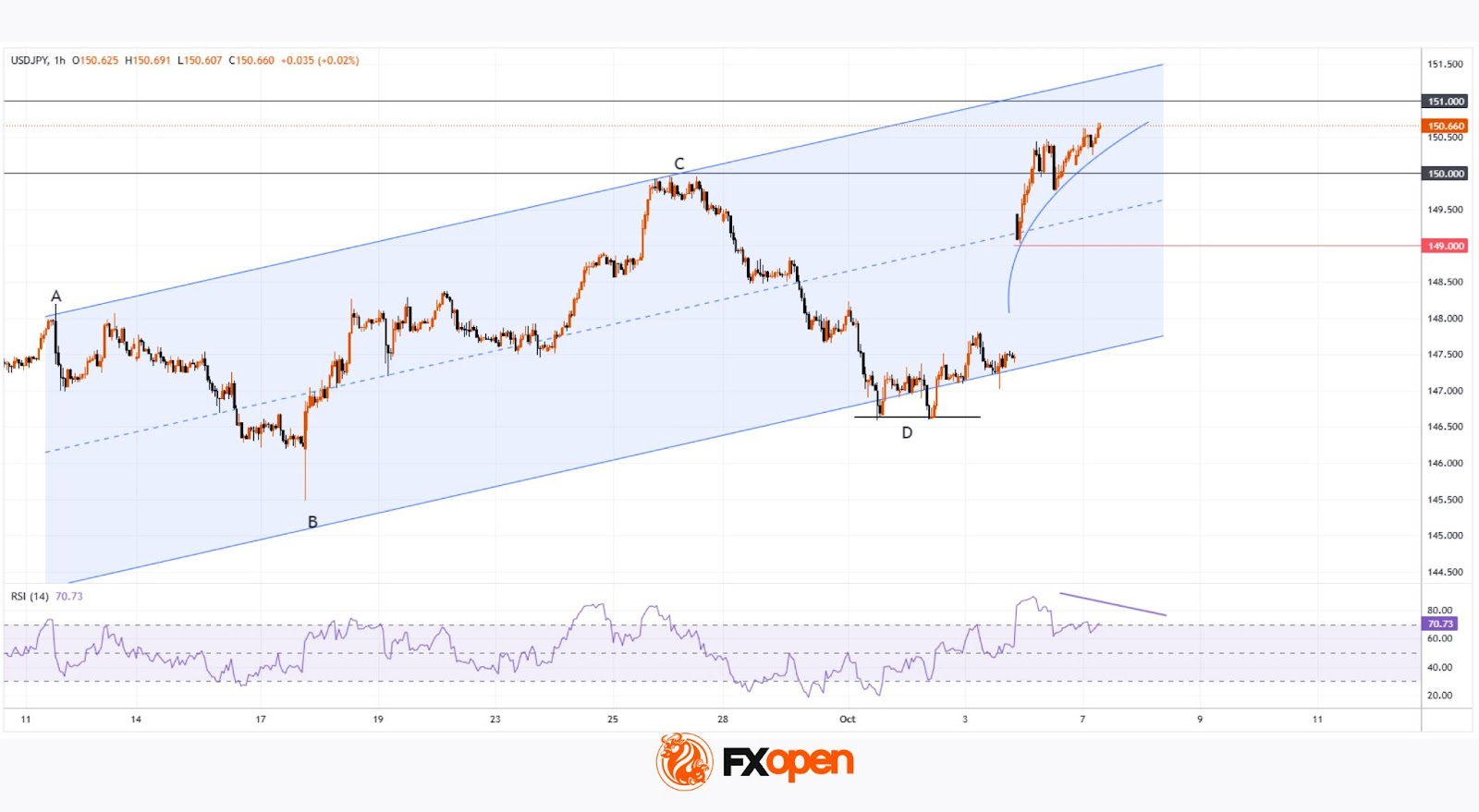 Как свидетельствует график USD/JPY, в начале этой недели произошло резкое ослабление японской иены. Торги открылись с бычьим гэпом, а сегодня обменный курс поднялся до 150.65 иен за доллар США.