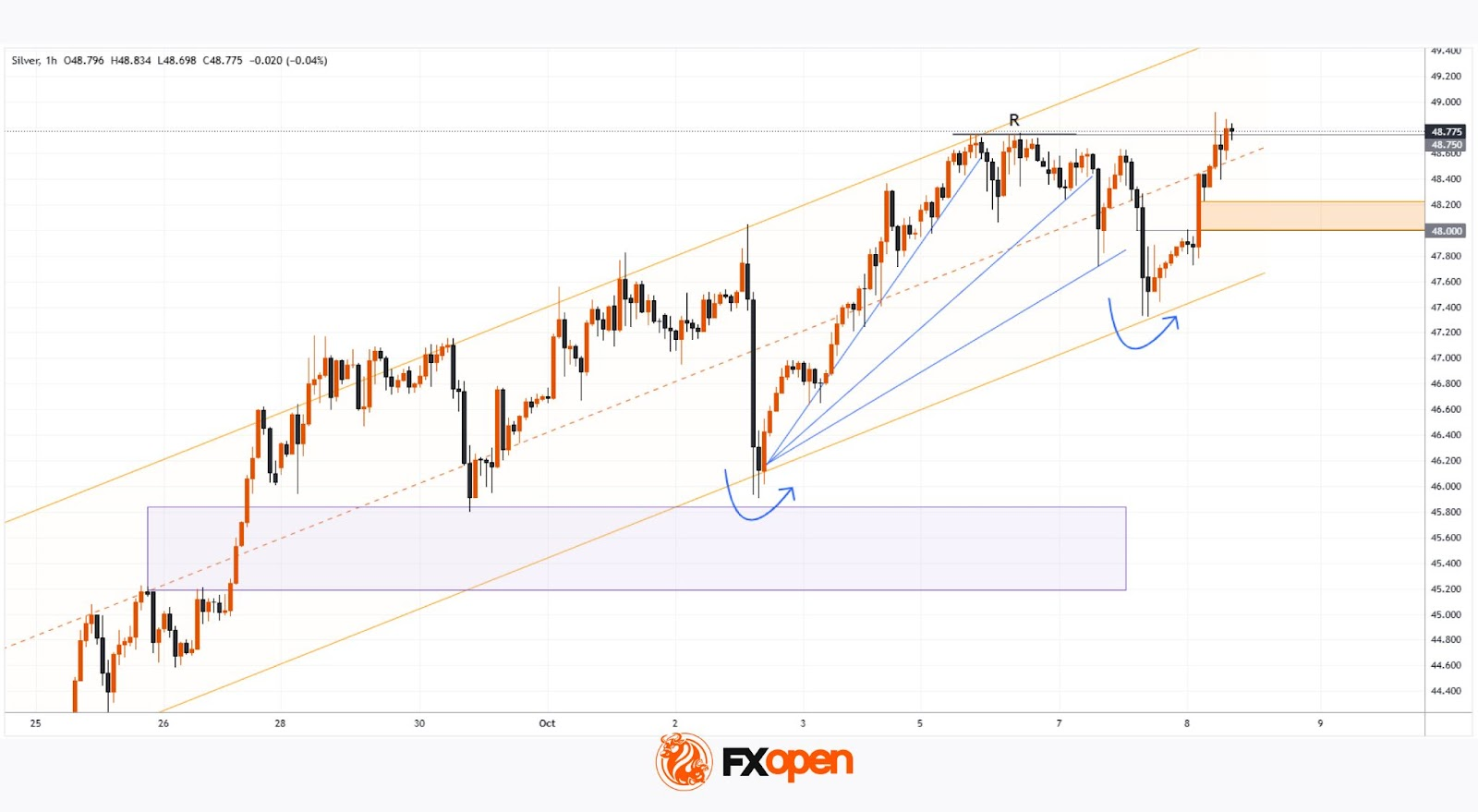 → как показано линией с буквой R (Resistance), цена серебра имеет проблемы с ростом в районе уровня 48.75;