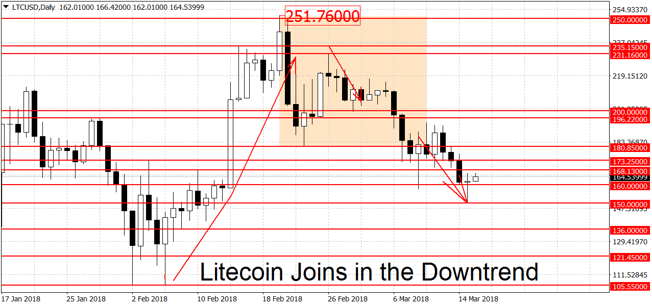 Как bitcoin, так и litecoin вновь вернулись в нисходящий тренд после недавнего спада. За последние 10 дней пара BTC/USD снизилась более чем на $2 000 и в данный момент котируется по цене 8 183 доллара за монету. Litecoin снизился на 30 долларов к текущей отметке $160.