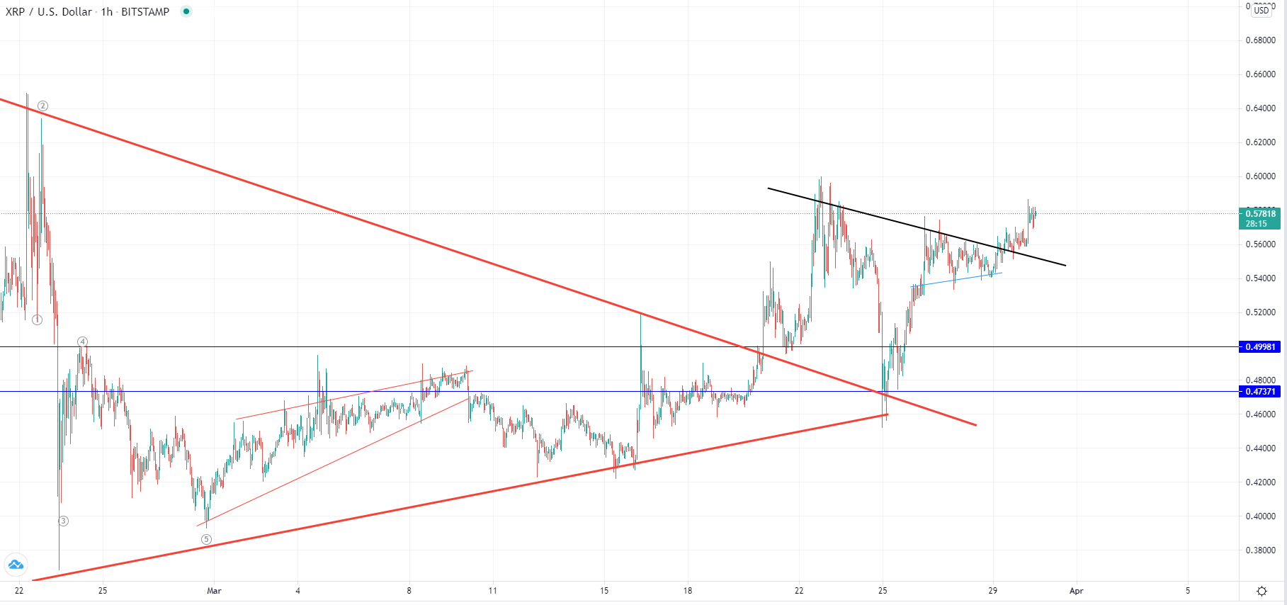 Цена Ripple резко снизилась 25-го числа и достигла нового более высокого минимума, но, в отличие от Bitcoin, она совершила это импульсивно. Это значит, что мы могли наблюдать попытку прорыва, но поскольку цена сумела отскочить от уровня сопротивления треугольника и горизонтального уровня на отметке 0.47371$, восстановившись обратно к уровням, с которых она упала, теперь мы можем ожидать дальнейшего восходящего движения. В настоящее время цена находится на уровне 0.5781$, что чуть ниже ее предыдущего максимума в 0.6$.