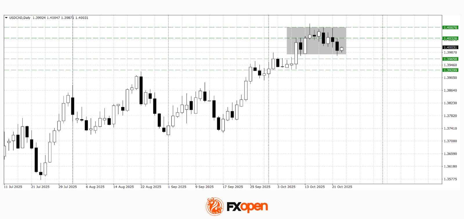 Валютная пара USD/CAD около двух недель торговалась в узком диапазоне 1.4000–1.4080. Замедление восходящего импульса привело к пробою поддержки у 1.4000 и снижению к 1.3970. Технический анализ указывает на вероятность дальнейшего спуска в область 1.3930–1.3960, где на дневном таймфрейме сформировалась разворотная модель “Башня” (Tower Top).