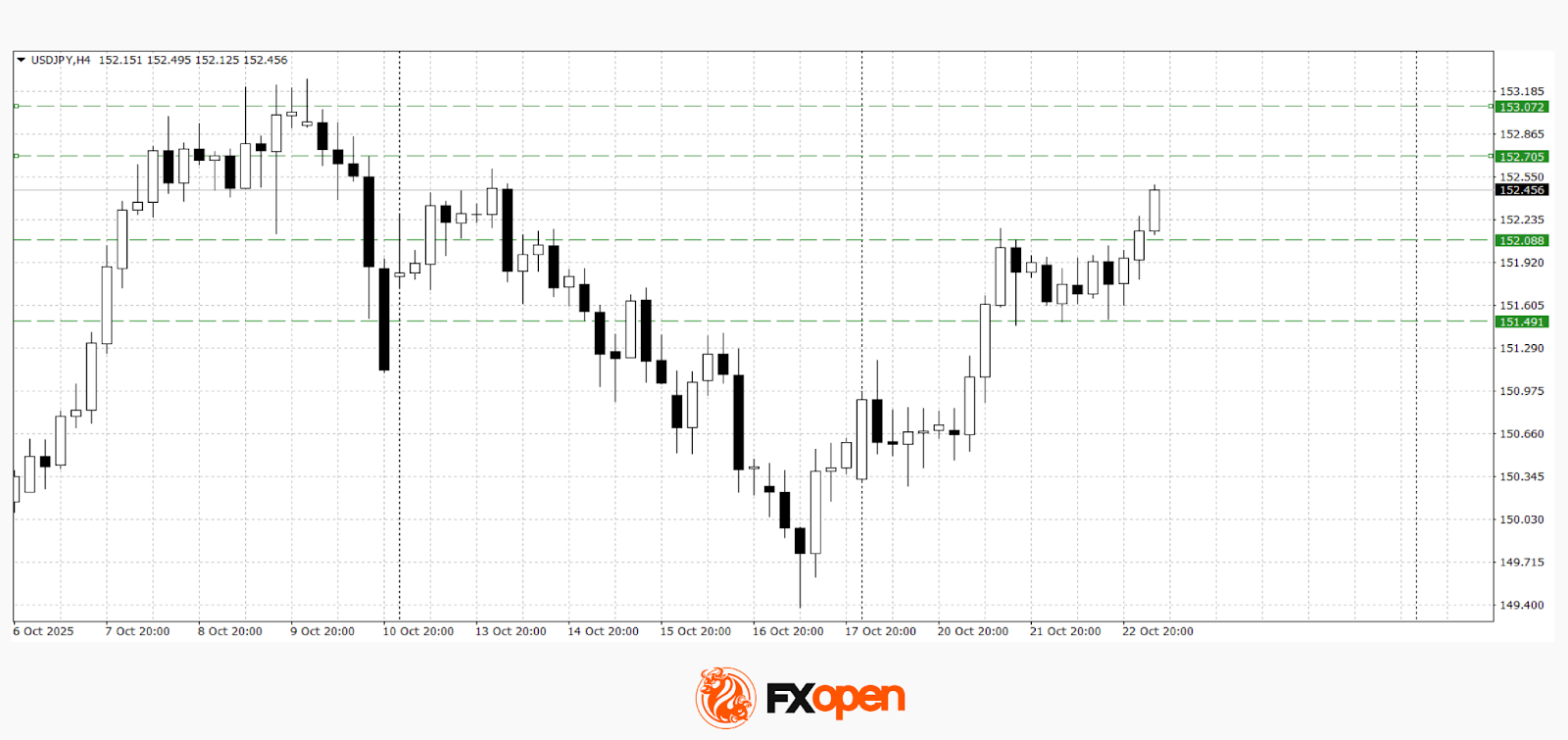 В начале недели валютная пара USD/JPY возобновила рост, так как иена оставалась под давлением фундаментальных факторов. После теста уровня 152.00 восходящее движение замедлилось, и цена перешла в консолидацию между 151.40–152.00. Сегодня ночью покупателям удалось продолжить рост и поднять курс выше 152.00. Ближайшей целью остаётся диапазон 152.70–153.20.
