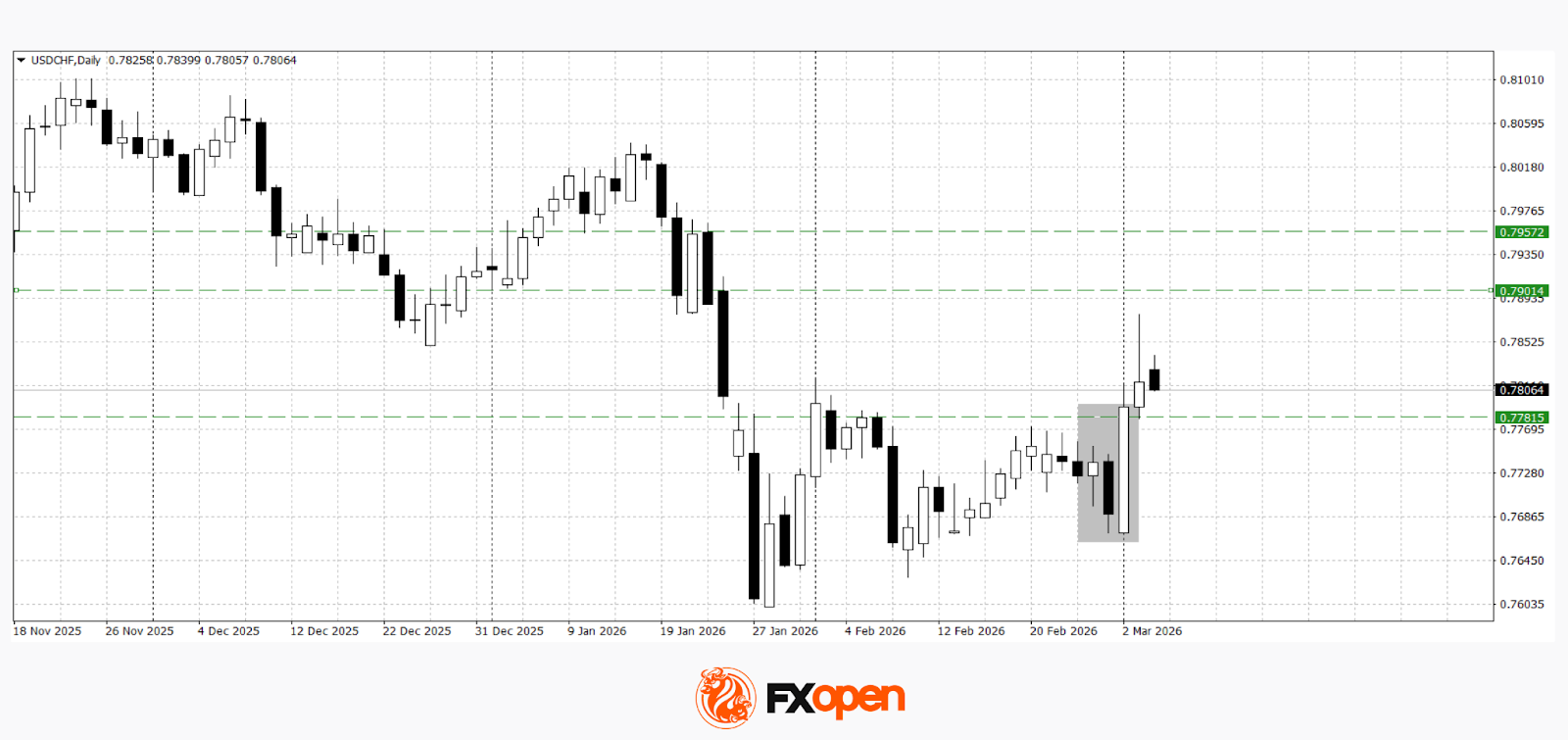 Валютная пара USD/CHF демонстрирует умеренное укрепление доллара, однако динамика пары более сдержанная из-за статуса швейцарского франка как защитной валюты. Тем не менее технический анализ USD/CHF указывает на возможность укрепления пары к 0.7900–0.7950, так как на дневном таймфрейме сформирована и подтверждена комбинация «бычье поглощение». Отмену восходящего сценария можно рассматривать после уверенного закрепления ниже 0.7780.