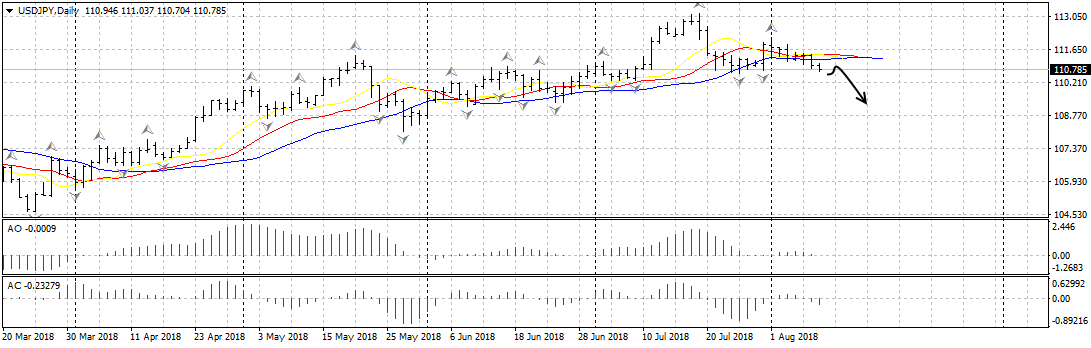 Американская валюта пользовалась спросом практически всю первую половину текущего года. Но лето близится к концу, и доллар помалу отдает ранее занятые позиции. Так, usd/jpy в конце июня подарила продавцам надежду на возможность начала нисходящего отката в виде разворотного бара на недельном таймфрейме. Отработка несколько затянулась, и цене удалось остаться выше линий аллигатора. Вместе с тем торговая война с Китаем перешла на новый уровень, а макроэкономическая статистика из США не блещет позитивом. Так, число открытых вакансий на рынке труда за июнь упало к 6,662М против прогноза в 6,740М. Прогноз по индексу цен производителей, который ожидаем сегодня, также негативный: 0,2% против 0,3% в июне. Все это вкупе может спровоцировать падение к 110 фигуре, а если продавцы сумеют укрепиться ниже, дорога к 109.00-108.00 будет открыта. Вместе с тем отбой от 110.20-110.00 может вдохновить покупателей гринбек к повторному подходу к 113.00. Завтра стоит обратить внимание на утренние новости из Японии. В три часа по мск будет опубликован показатель ВВП страны за второй квартал. Аналитики прогнозируют рост индекса к 0,3%, что может поспособствовать укреплению иены и дальнейшему падению usd/jpy.