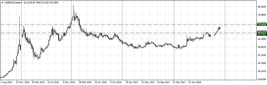 Вместе с фунтом за звание самой слабой валюты недели соревнуется и российский рубль. Вероятность новых санкций и сильный доллар позволили паре укрепиться выше значимой отметки 65.00. И если существующая тенденция сохранится, вполне реально ожидать скорого теста 67 или даже 68 фигуры. Ближайшая поддержка расположена у 64.30-64.00.
