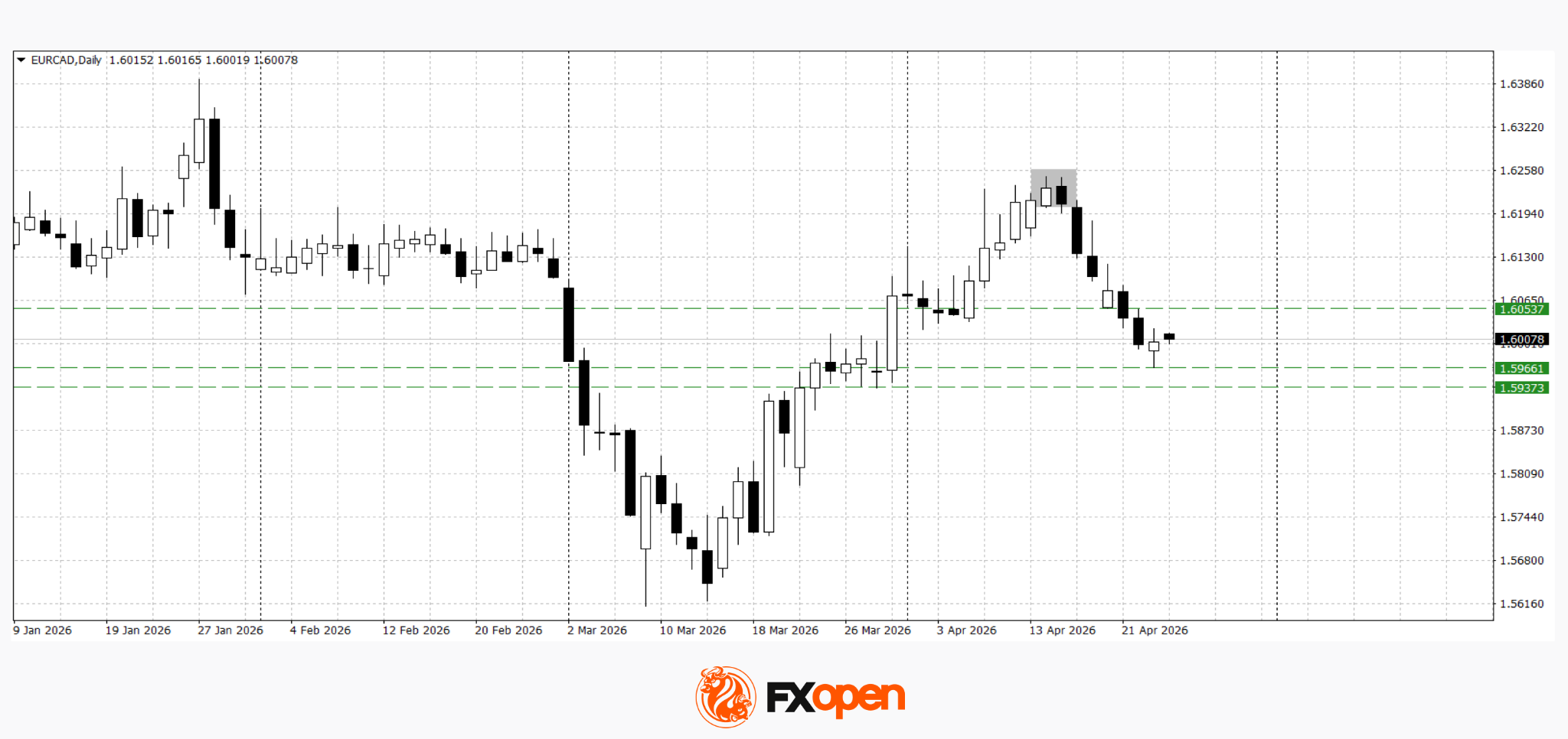 Пара EUR/CAD также демонстрирует коррекционное снижение, тестируя значимые уровни на фоне разнонаправленных фундаментальных факторов. Технический анализ EUR/CAD свидетельствует о возможности продолжения нисходящего движения в направлении 1.6000–1.5940, так как на дневном таймфрейме сформирована подтверждённая медвежья комбинация «пинцет». Уход выше 1.6050 может способствовать возвращению на рынок покупателей EUR/CAD.