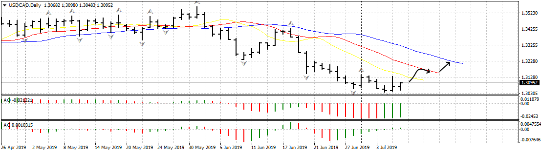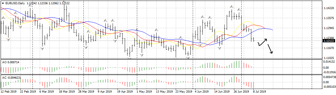 В конце июня фунт демонстрировал укрепление и готовился к смене среднесрочного тренда. Но силы покупателей иссякли, и после теста линий аллигатора на дневном таймфрейме пара gbp/usd потеряла свыше 200 пп. На данный момент цена нашла поддержку у 1.2480, но ожидать роста без фундаментальной поддержки не стоит. Тем более, что перевес по фундаменту пока на стороне гринбек. Так, данные опубликованные в пятницу показали, что количество новых рабочих мест в США увеличилось на 225К, что значительно больше прогноза в 160К. В свою очередь показатель средней заработной платы остался на прежнем уровне вопреки прогнозам роста от аналитиков, а безработица увеличилась с 3,6% до 3,7%. После публикации NonFarm важно, как эти данные интерпретируют чиновники из ФРС: будет ли понижена базовая процентная ставка уже на ближайшем заседании, и какой будет дальнейшая кредитно-денежная политика регулятора. Ответы на эти вопросы инвесторы будут искать во время выступления Джерома Пауэлла, которое состоится сегодня в 15.45 по мск.