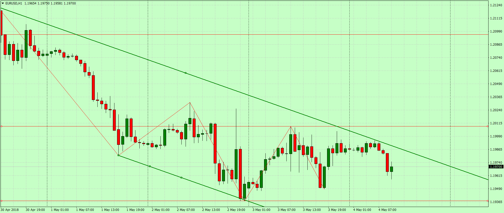 По минимумам последних дней сформирован нисходящий канал. Сейчас цена находится около верхней границы. Её прорыв может означать разворот локального тренда и возврат выше уровня 1.2000.