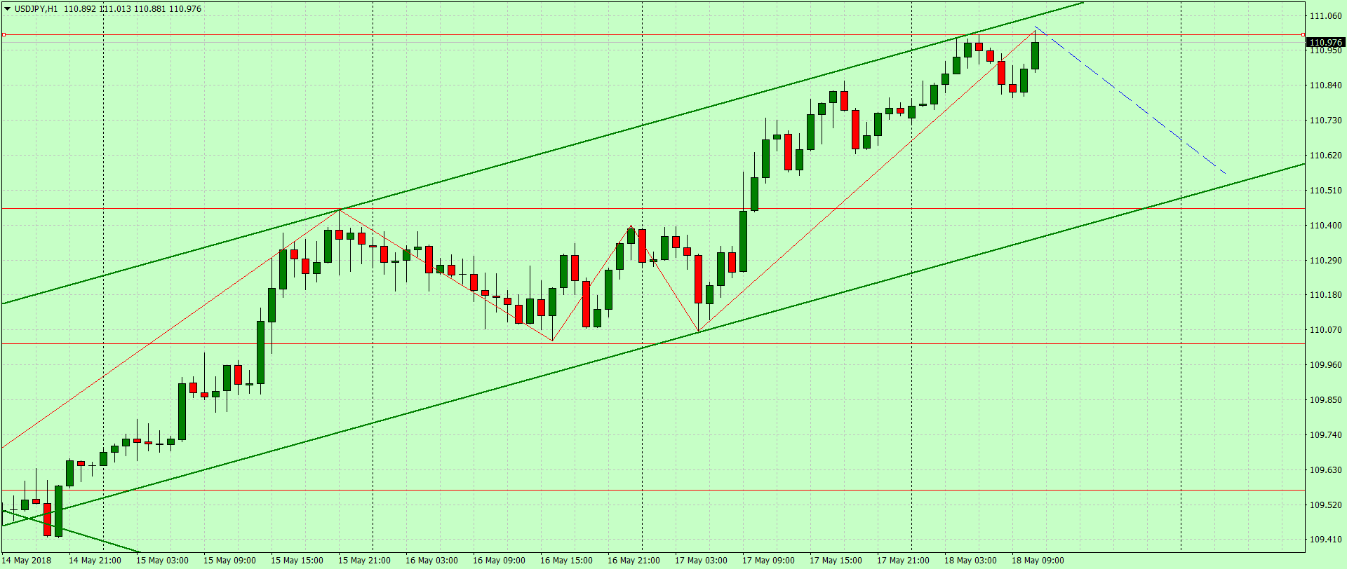 На часовом графике сохраняется восходящий канал. Сейчас цена находится около верхней границы канала, но после резкого роста возможно коррекционное снижение в район 110.50-60.