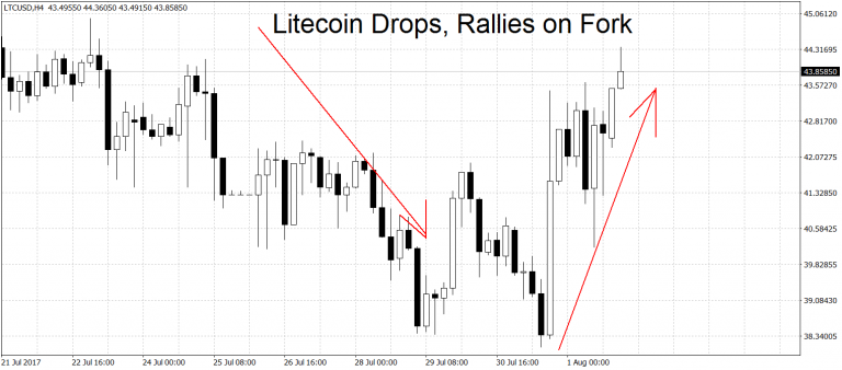 Цены на Litecoin упали до минимума в 38,11 доллара США 31 июля, так как альткоины продавались повсеместно для получения BTC, тем самым освободив BCC. С появлением создателя LTC Чарли Ли на CNBC цена на лайткоин упала примерно на день раньше, чем у большинства альткоинов. 31 июля после интервью цены на валюту выросли до $43 долларов за монету и остались до сих пор на том же уровне.