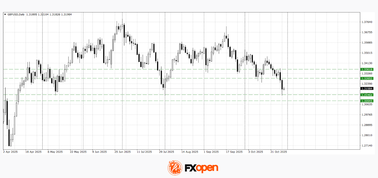 Растерянность инвесторов после вчерашнего решения ФРС способствовала тесту августовских экстремумов текущего года у 1.3140. Ниже данной отметки пара GBP/USD не торговалась с мая 2025 года. Закрепление цены ниже 1.3140 может способствовать резкому усилению нисходящего тренда. Ближайшей областью для восходящего отката выступает диапазон 1.3280–1.3300.