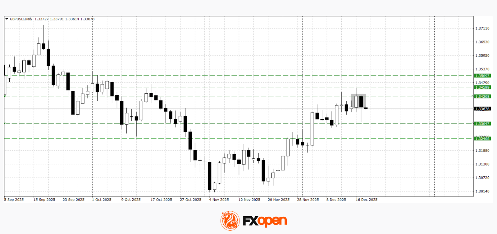 Фунт консолидируется в ожидании решения Банка Англии по процентной ставке, а взгляд инвесторов постепенно смещается на завтрашнее заседание Банка Японии. Британская валюта демонстрирует осторожную динамику, поскольку рынки практически полностью заложили в цены снижение базовой ставки на 25 базисных пунктов до 3,75% на сегодняшнем заседании после того, как инфляция Великобритании неожиданно снизилась до 3,2% в ноябре - это минимальный уровень за последние месяцы и ниже прогнозов аналитиков, что усилило ставки на смягчение монетарной политики.