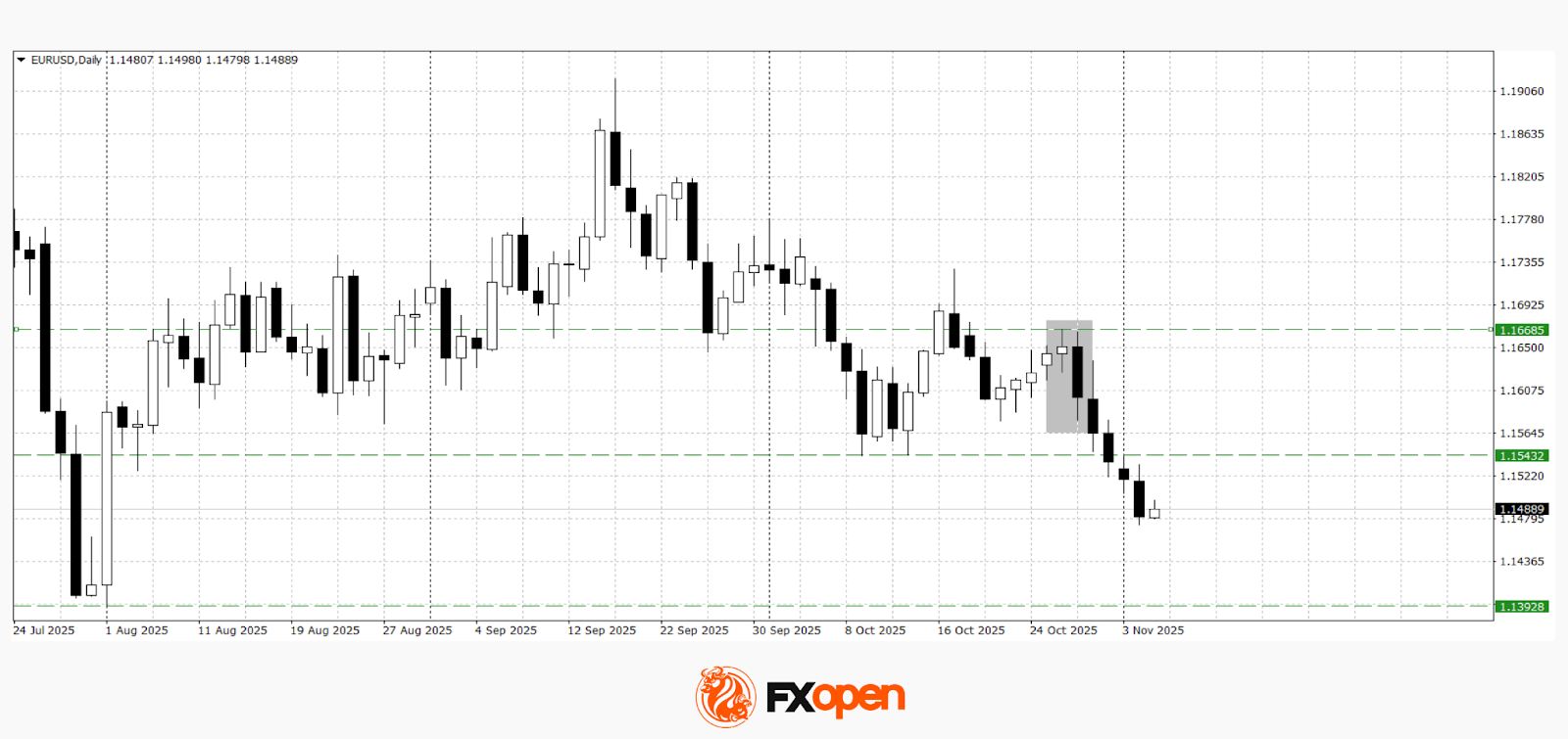 Европейские валюты остаются под давлением третью неделю подряд: евро консолидируется у нижних границ диапазона, а фунт продолжает снижение в преддверии заседания Банка Англии. Давление на пары сохраняется на фоне усиливающейся неопределенности на глобальных рынках. Дополнительным фактором выступают риски продолжающегося шатдауна в США, способные затормозить публикацию ключевых данных и повлиять на оценку монетарных перспектив ФРС.