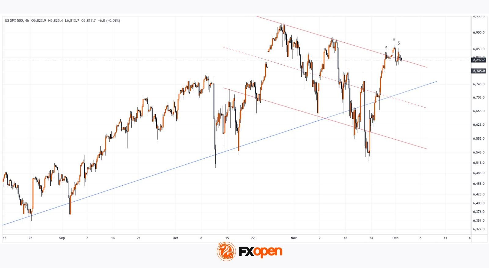 Анализ действия цены на 4-часовом графике индекса S&P 500 (US SPX 500 mini на FXOpen) дает смешанную картину.
