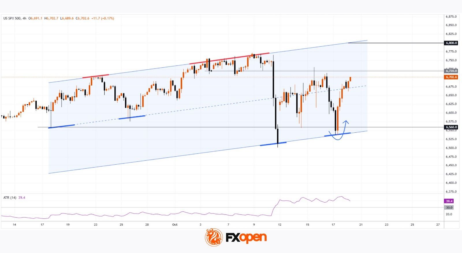 На 4-часовом графике индекса S&P 500 (US SPX 500 mini на FXOpen) индикатор ATR со стандартными настройками не опускается ниже уровня 30, что указывает на текущую повышенную волатильность рынка по сравнению с предыдущими периодами. На решения трейдеров влияют продолжающийся шатдаун, а также новости о тарифной сделке между США и Китаем, а также сезон отчетностей, который набирает ход. Также на рынок влияли опасения по поводу кризиса в региональных банках и фиксации прибыли по акциям компаний, связанных с искусственным интеллектом.