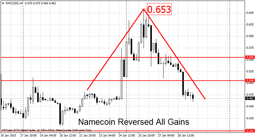 Криптовалюты потеряли почти всю прибыль, полученную в предыдущую пару дней. На сегодняшний день Bitcoin стоит 217$ – значительно меньше уровня 300$, возле которого BTC был всего три дня назад. Litecoin торгуется на 25% ниже по сравнению с максимумом 2.40$. Namecoin котируется 0.46$ – на 20 центов ниже по сравнению с его ценой в понедельник.