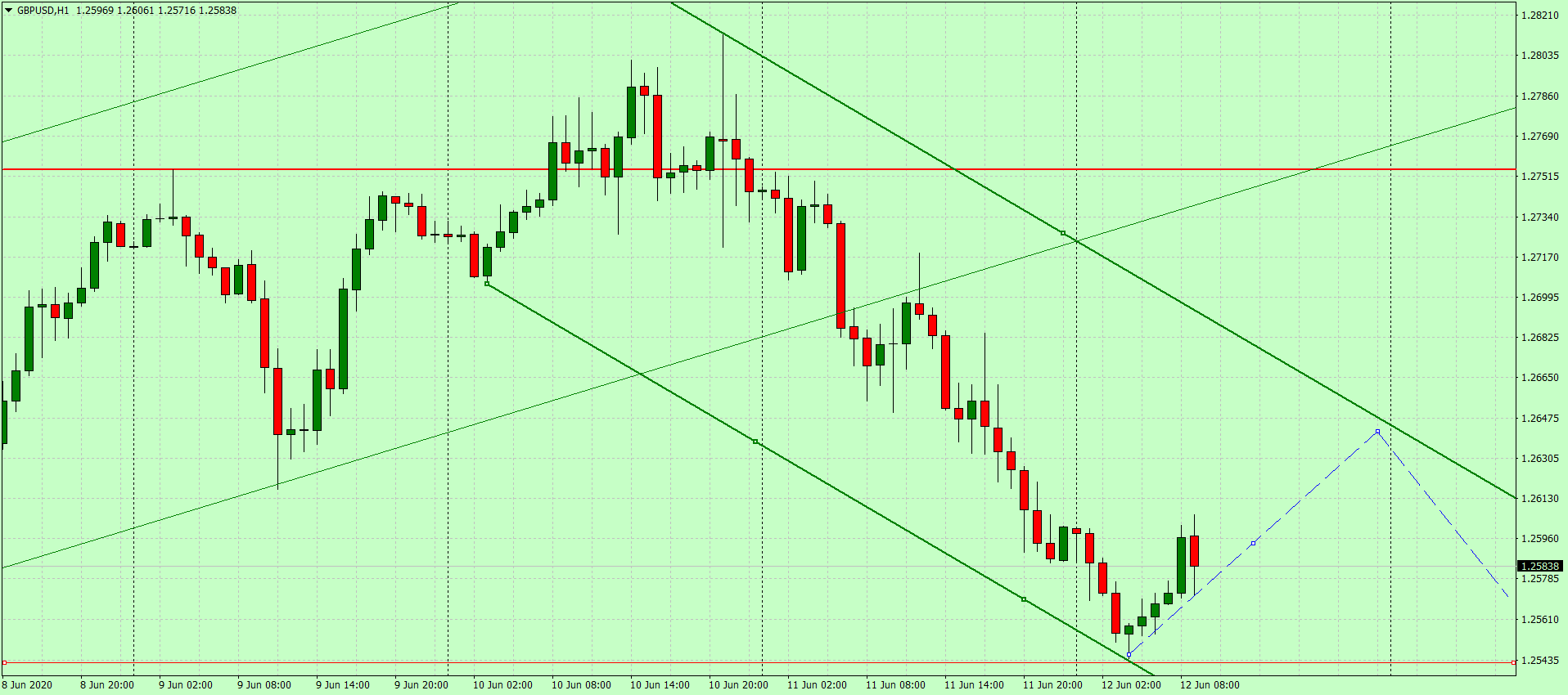 Восходящий канал сломан и по минимумам недели сформировался новый нисходящий канал. Сейчас цена находится посредине канала и движется к верхней границе.