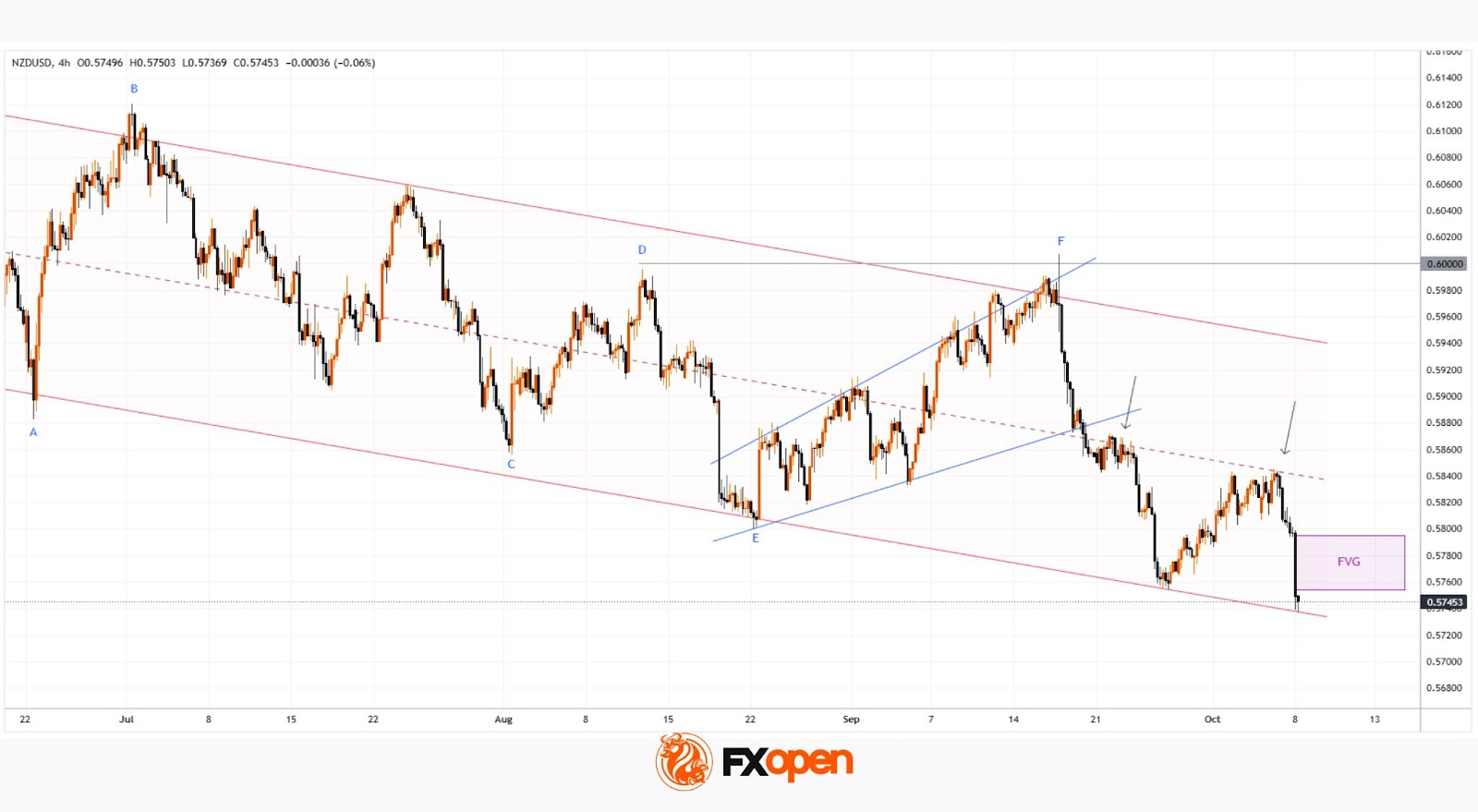 Колебания курса “киви” во второй половине 2025 формируют на графике нисходящий канал, причем обратите внимание на то, что вершина F: