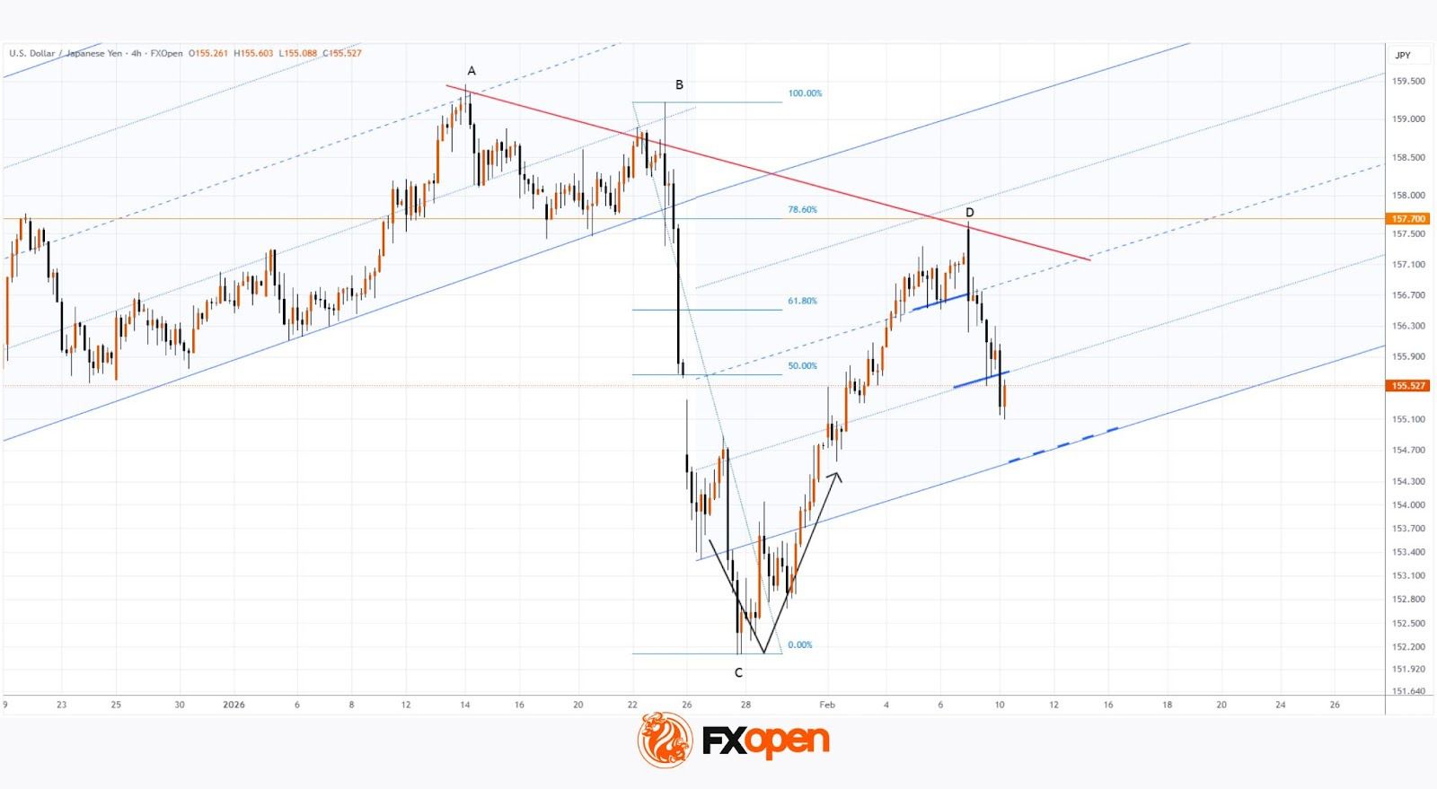 → на графике USD/JPY сформировались более низкие максимумы A-B-D (через них проведена линия медвежьего тренда).