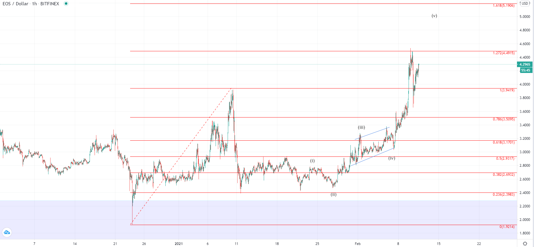Другая возможность заключается в том, что сегодня наблюдается начало нового импульса более низкого уровня, который должен превысить вчерашний максимум. Это будет подтверждено, если цена сумеет вырасти выше уровня 1.272 Фибоначчи на текущем подъеме. Однако если она снова встретит сопротивление, то может образоваться двойная вершина, и откат может снова подтолкнуть цену ниже 4$. В любом случае ожидается дальнейший рост цены EOS.
