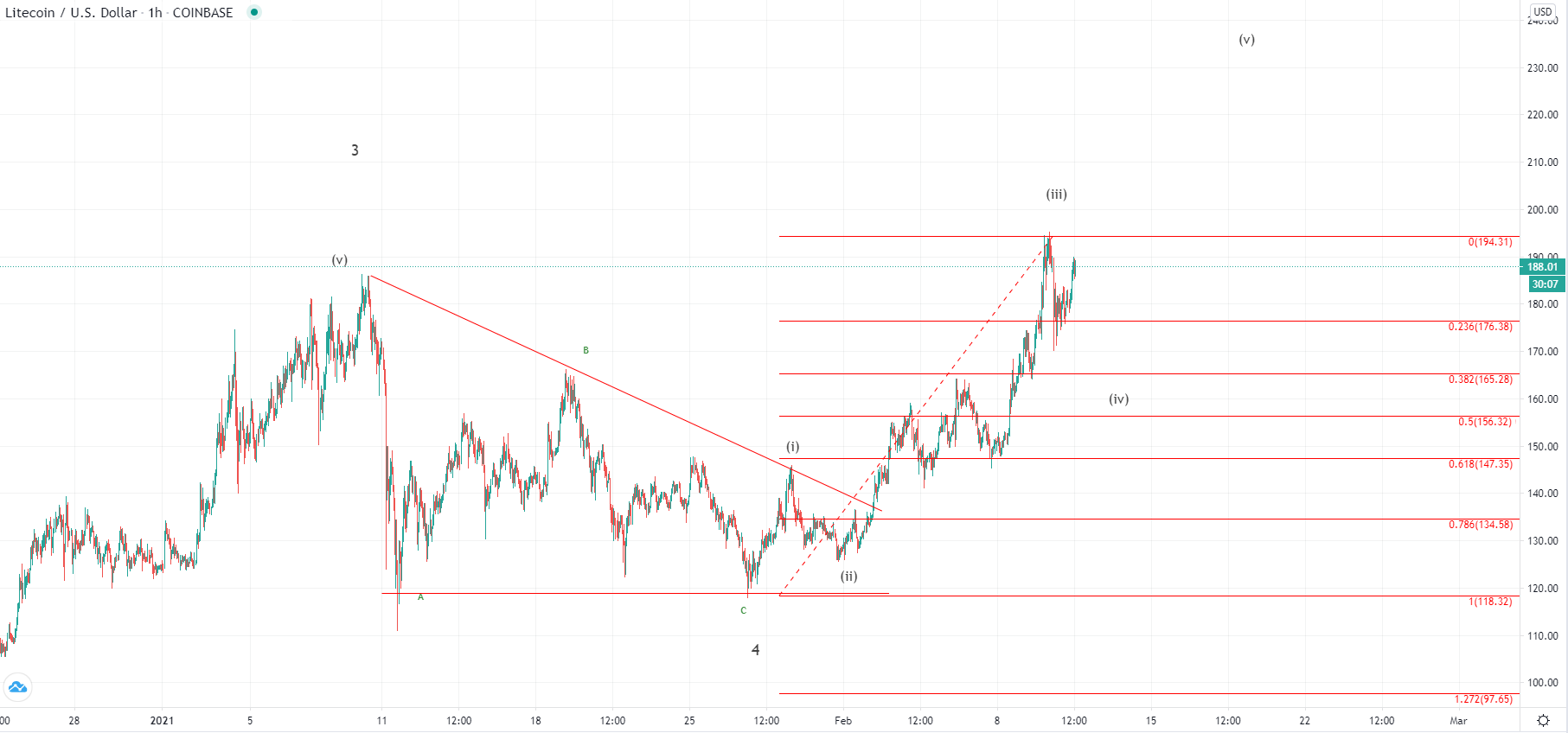 На часовом графике видно, что цена пробила предыдущий максимум, достигнутый 10 января, когда цена Litecoin находилась на уровне 185,58$. Это подтвердило импульсивность этого движения и то, что предыдущая коррекция закончилась на отметке 118$. Мы наблюдали развитие 3-й суб-волны импульса более высокого уровня, поэтому следует ожидать дальнейшего роста. Однако если вчерашний максимум был концом 3-й волны, то сейчас цена может быть настроена на локальную коррекцию.