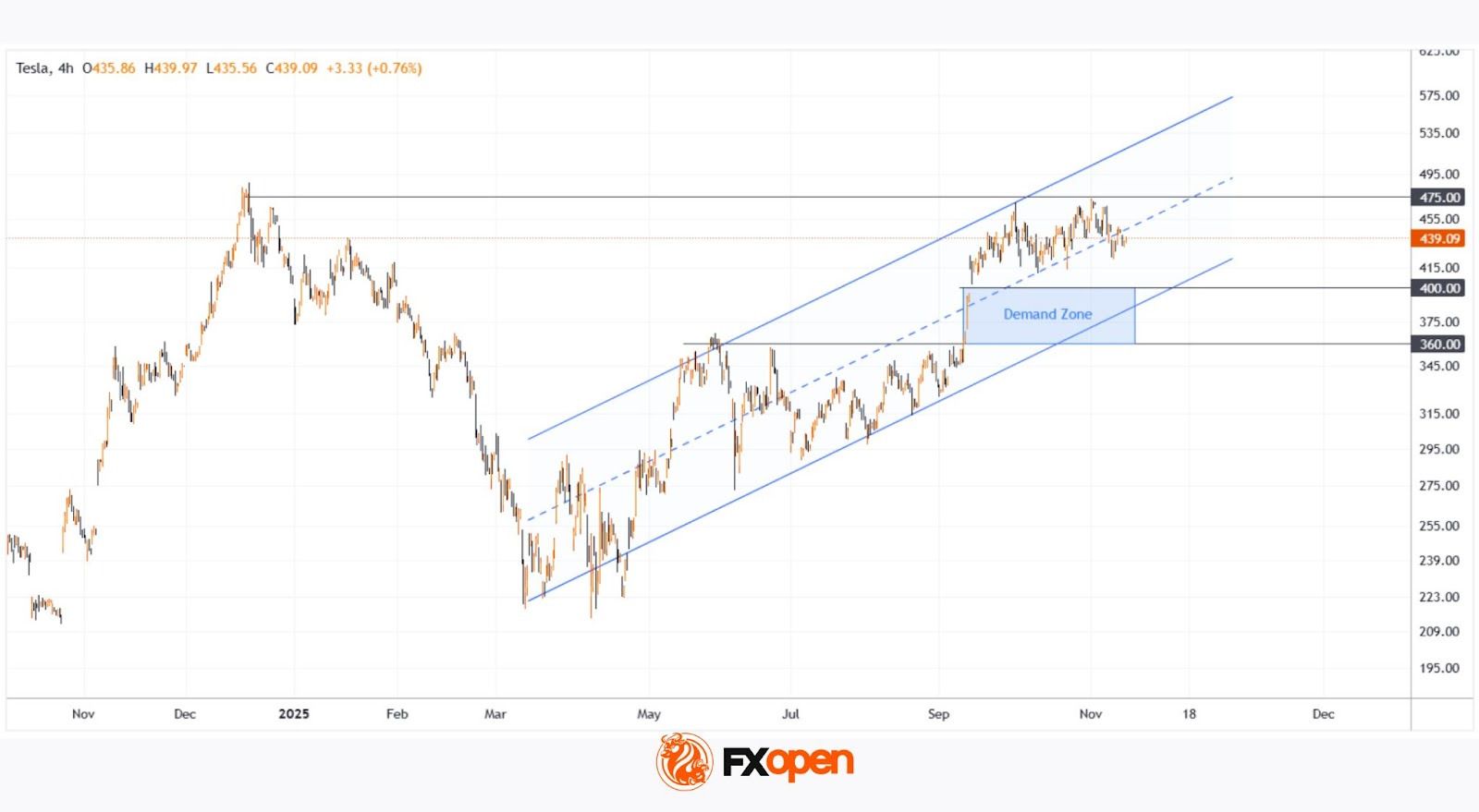 → сентябрьский резкий рост образовал зону спроса, где дисбаланс покупателей и продавцов привел к росту цены TSLA – верхняя граница этого канала в районе психологической отметки $400 может работать как поддержка в дальнейшем.