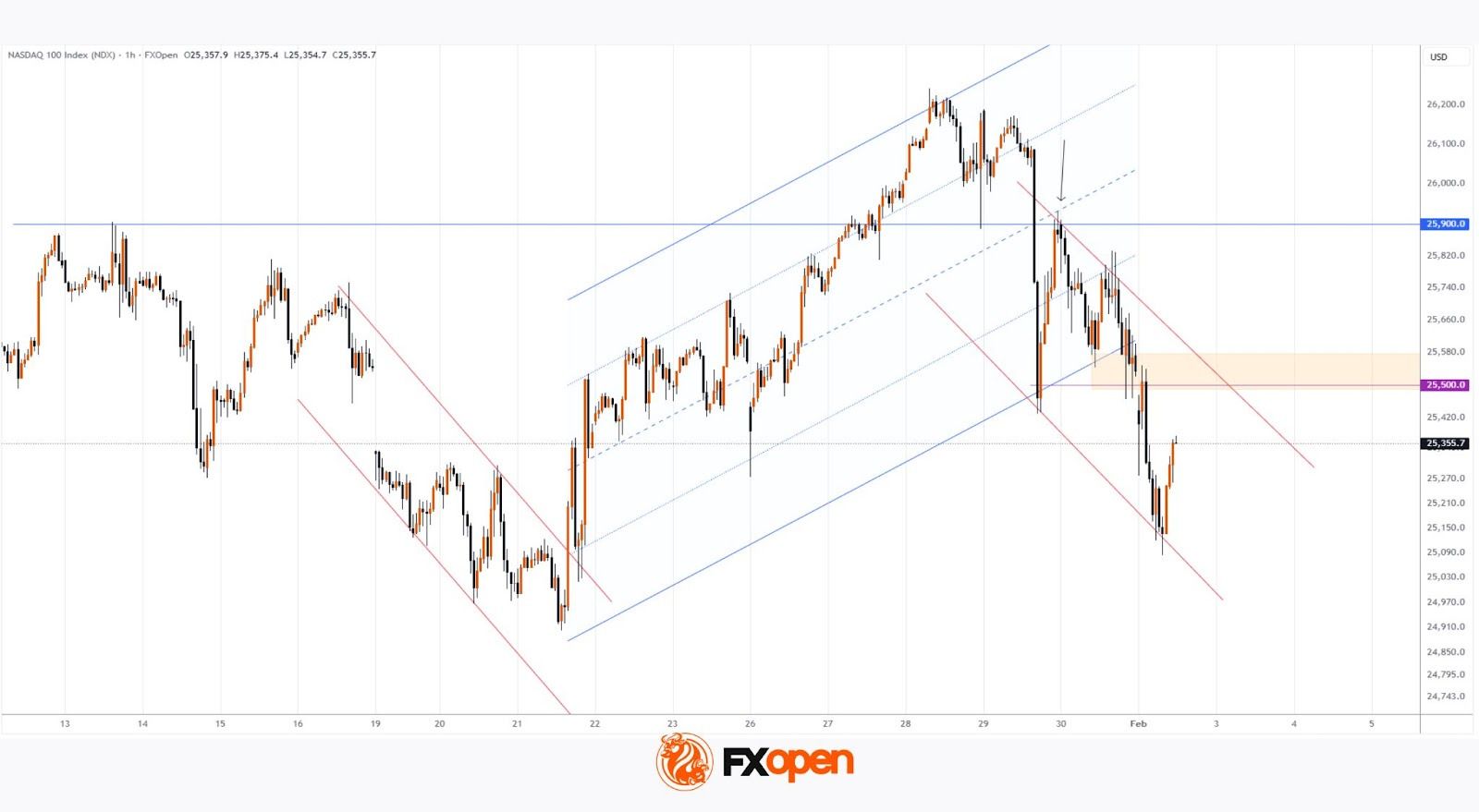 На прошлой неделе были опубликованы квартальные отчеты Microsoft (MSFT), Meta Platforms (META), Tesla (TSLA), Apple (AAPL). А на открытии торгов в понедельник – сегодня, 2 февраля – мы видим на графике индекса Nasdaq 100 (US Tech 100 mini на FXOpen) медвежий гэп и снижение у уровню 25100.