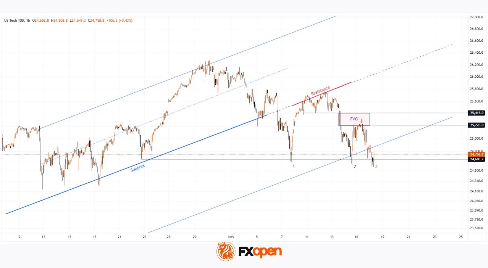 Анализируя часовой график индекса Nasdaq 100 (US Tech 100 mini на FXOpen) 10 ноября, мы построили восходящий канал. Однако нарастающее давление продавцов привело к тому, что: